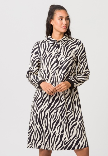 Платье женское с блузочным воротником и короткой планкой на пуговицах. Это платье сочетает в себе несколько модных тенденций! Модный анималистический принт, элегантный крой рубашки, спортивные ребристые манжеты – здесь объединены лучшие дизайнерские особенности, чтобы создать спортивное, шикарное женское платье. Струящаяся ткань купровискозы имеет матовый блеск, а в боковые швы встроены прорезные карманы. Отличная мода на каждый день.