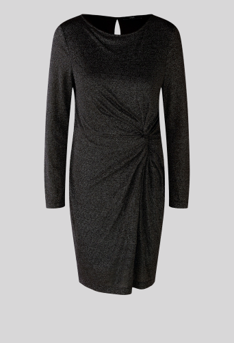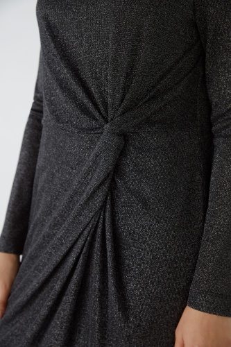 Комфортное платье из эластичного вискозного трикотажа с блестящей пряжью. Облегающий крой, длина до колена. Женственный круглый вырез. Небольшой разрез сзади, не застегивается, легко надевается. Трикотажная подкладка на теле Красивые рюши на талии со скрывающим эффектом. Длина для размера 42 - 92 см.