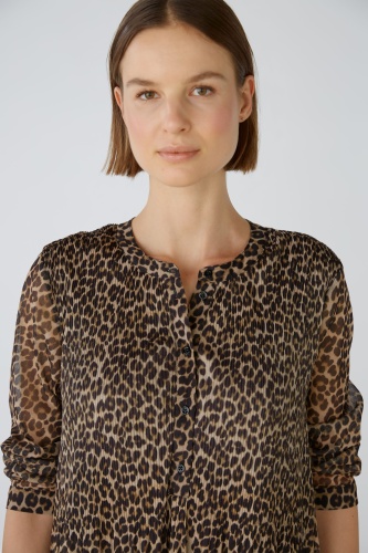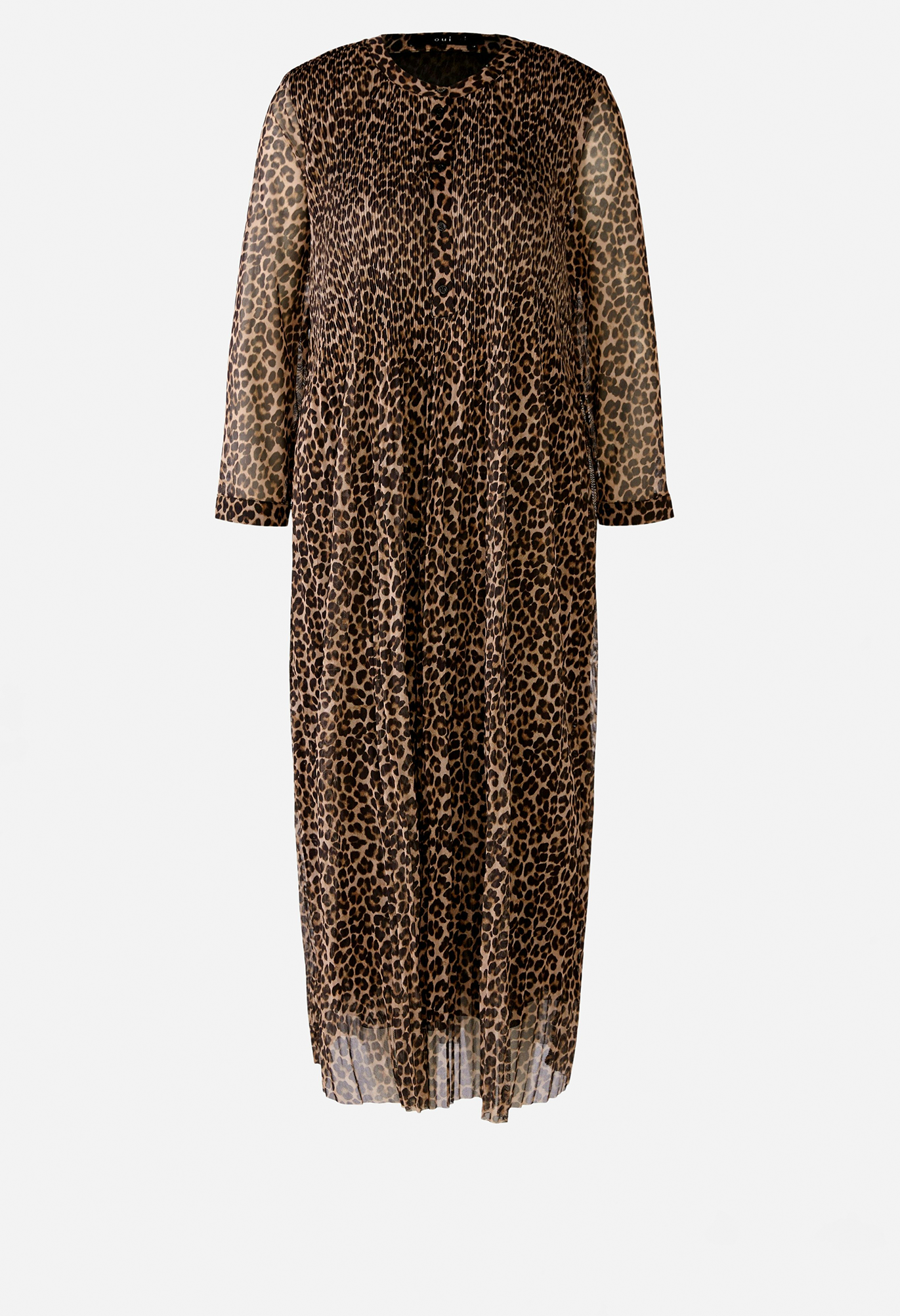 Струящееся платье из сетки со складками и принтом по всей поверхности. Свободный крой, длина миди. Круглая горловина с длинной планкой на пуговицах, легко надевается. Рукава длиной 3/4 с манжетами и маленькой пуговицей. Плотно прилегающие складки на верхней части тела, свободные и струящиеся в области юбки. Длина для размера 42: 126 см.
