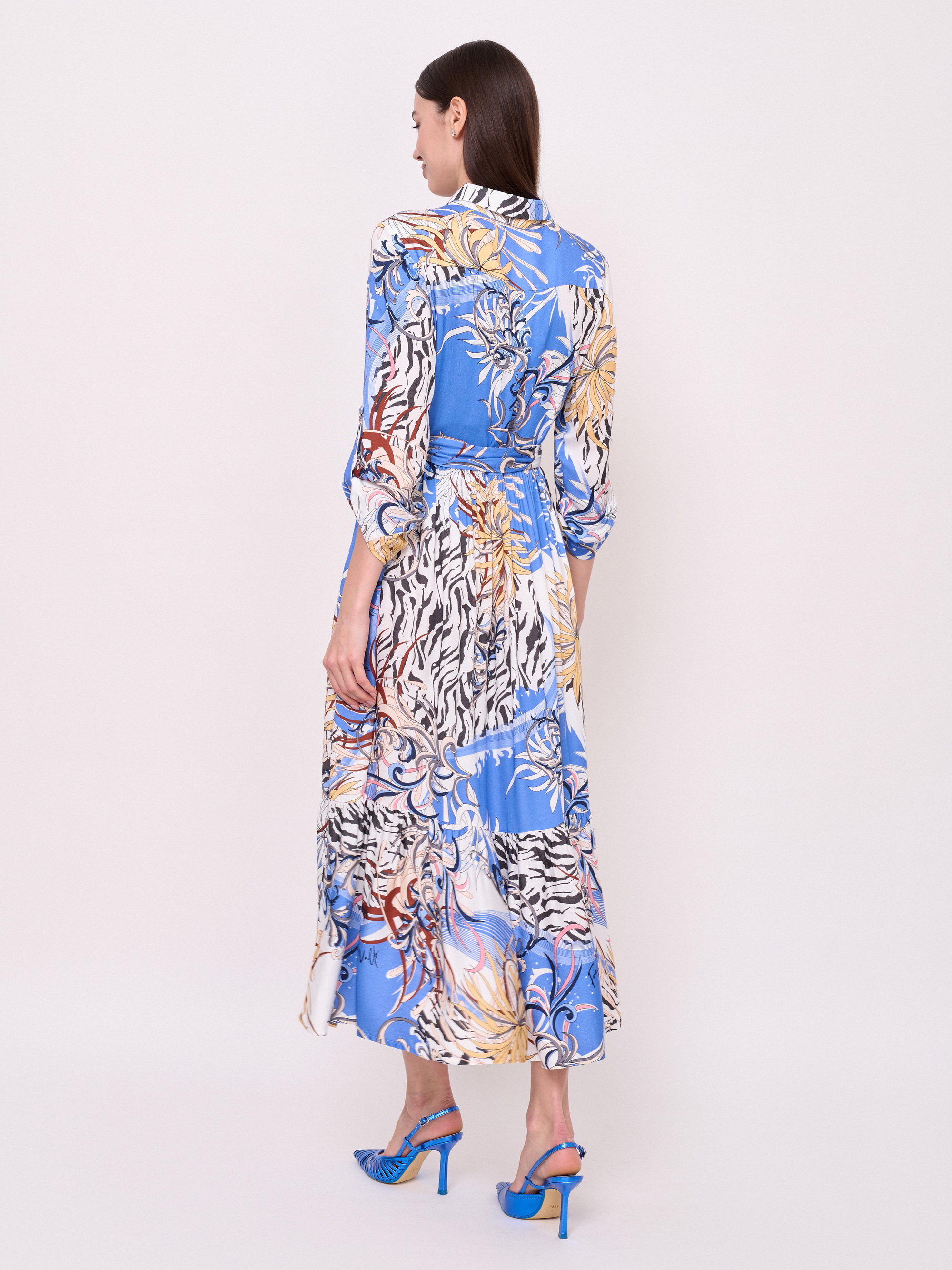 Визкозная ткань, застежка пуговицы, вырез горловины отложной воротничок, рукава 7/8 с хлястиками на пуговице, покрой рубашечный, рисунок орнамент, карманы в шве, конструктивные элементы воланы, длина платья макси, пояс из основной ткани. Длина по спинке: 126 см.