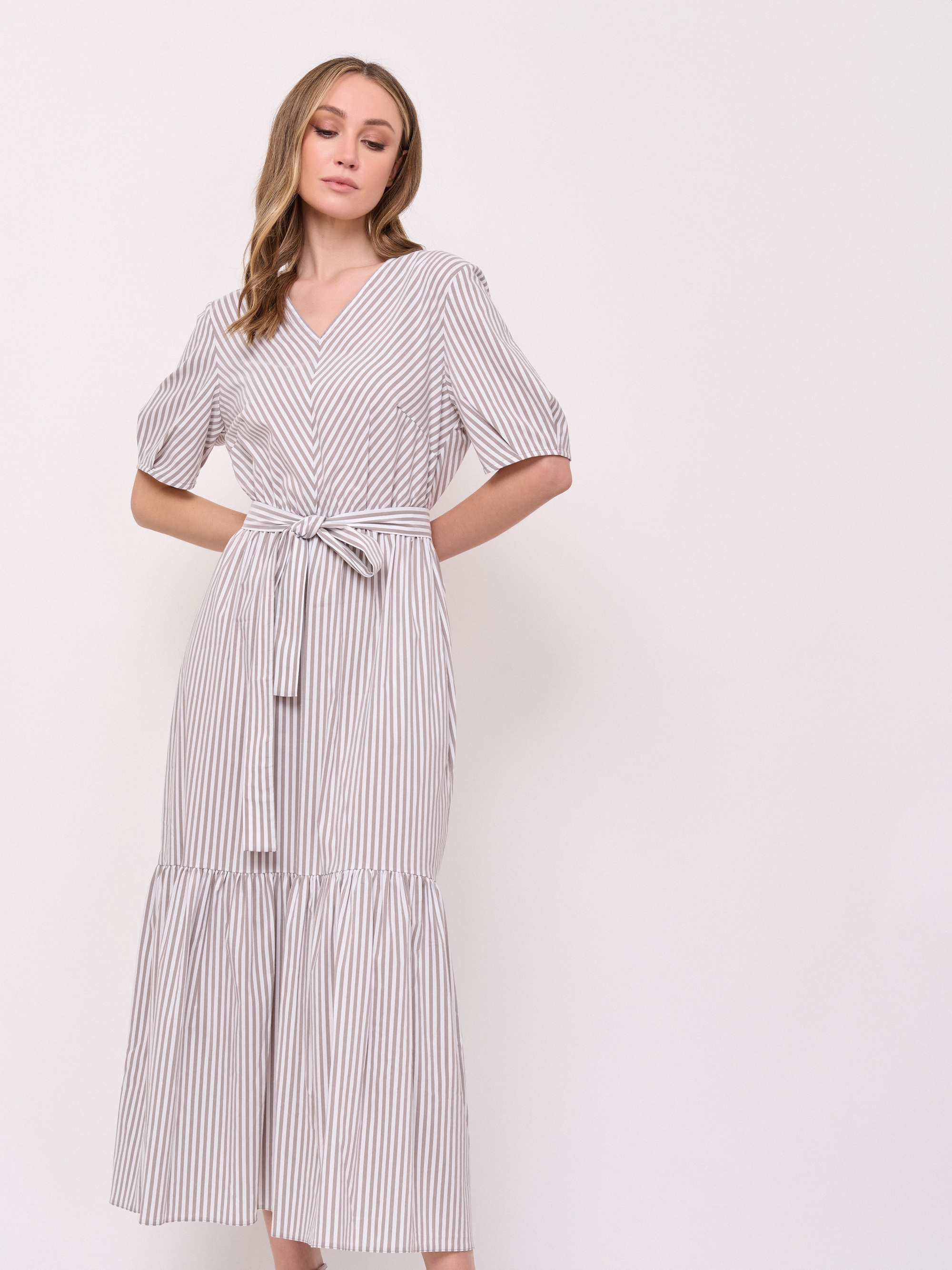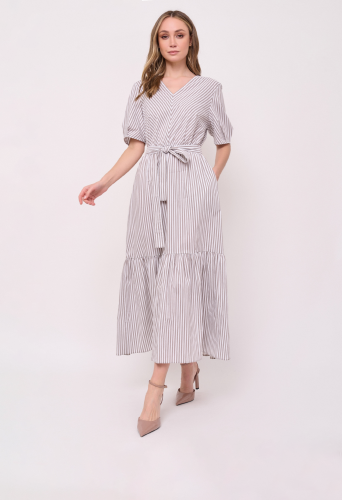 Детали: без застежки, вырез горловины v-образный, рукава короткие, покрой расклешенный, рисунок полоска, карманы в шве, конструктивные элементы воланы, длина платья макси, резинка по линии талии, пояс из основной ткани, ажурная спинка. Длина по спинке: 129 см.
