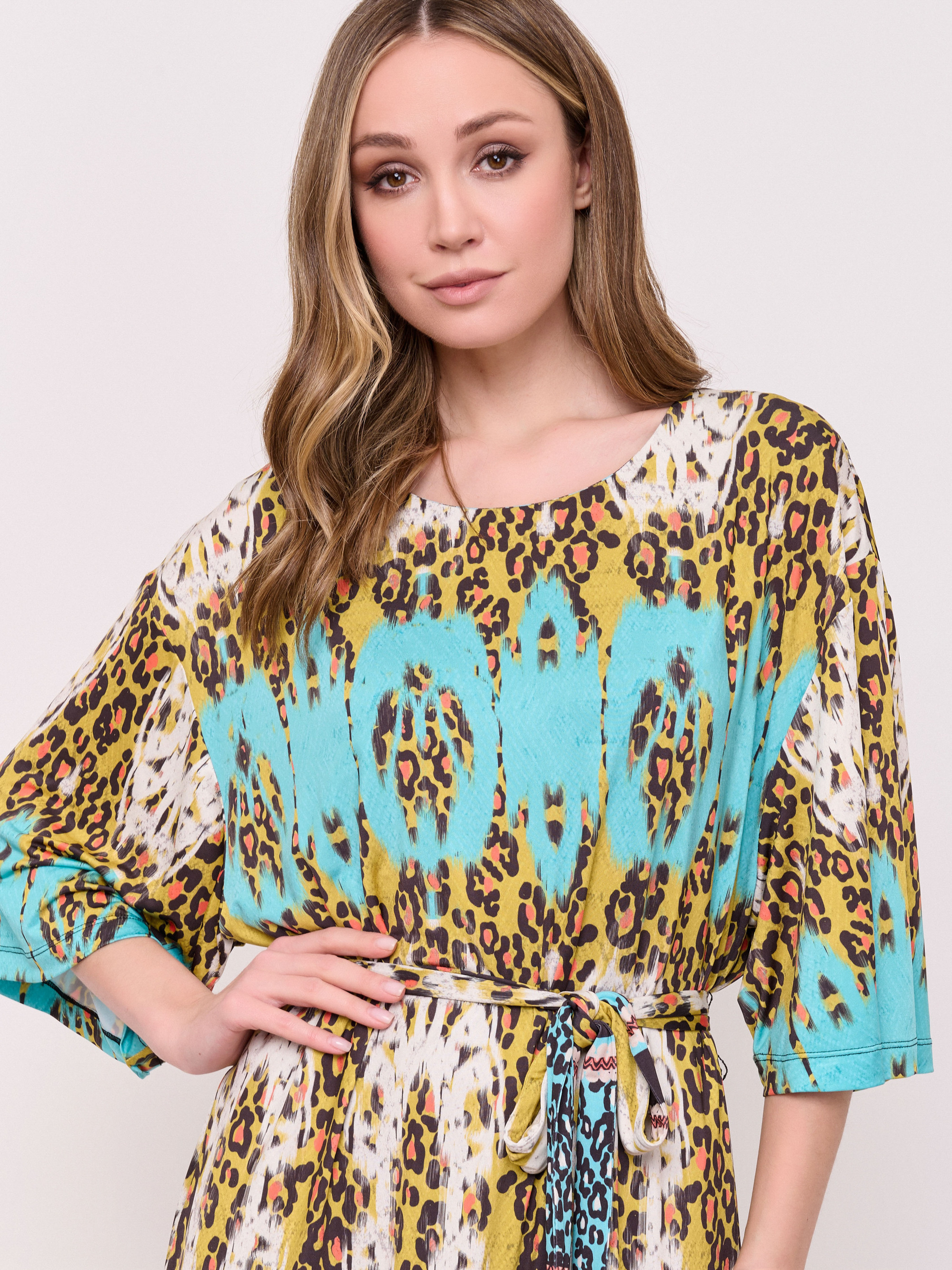 Детали: без застежки, вырез горловины округлый, рукава 3/4, покрой прямой, рисунок орнамент, без карманов, конструктивные элементы пояс, длина платья миди, нижний слой. Длина по спинке: 115 см.