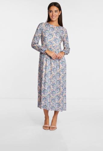 Платье удивительно женственное с романтическим цветочным узором. Верх свободного кроя, юбка длины миди имеет широкую, ниспадающую форму. Оборки на манжетах рукавов и изящная пуговица на шее подчеркивают игривый образ.