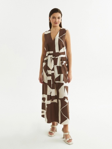Стильное платье без рукавов из хлопковой ткани свободного А-силуэта длины миди с V-образным вырезом горловины и крупными накладными карманами. В комплект входит съемный пояс из ткани для создания более приталенного силуэта.