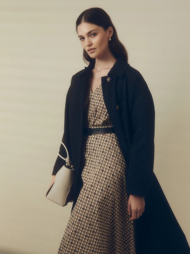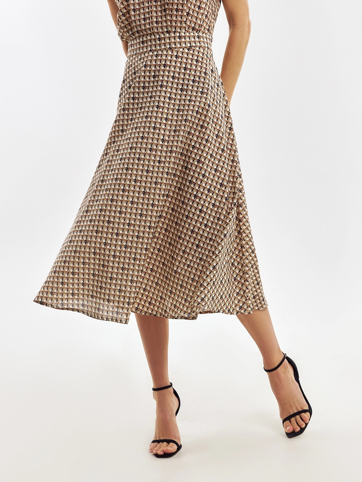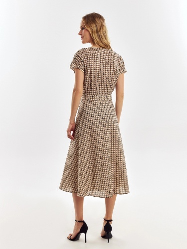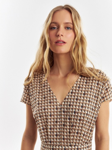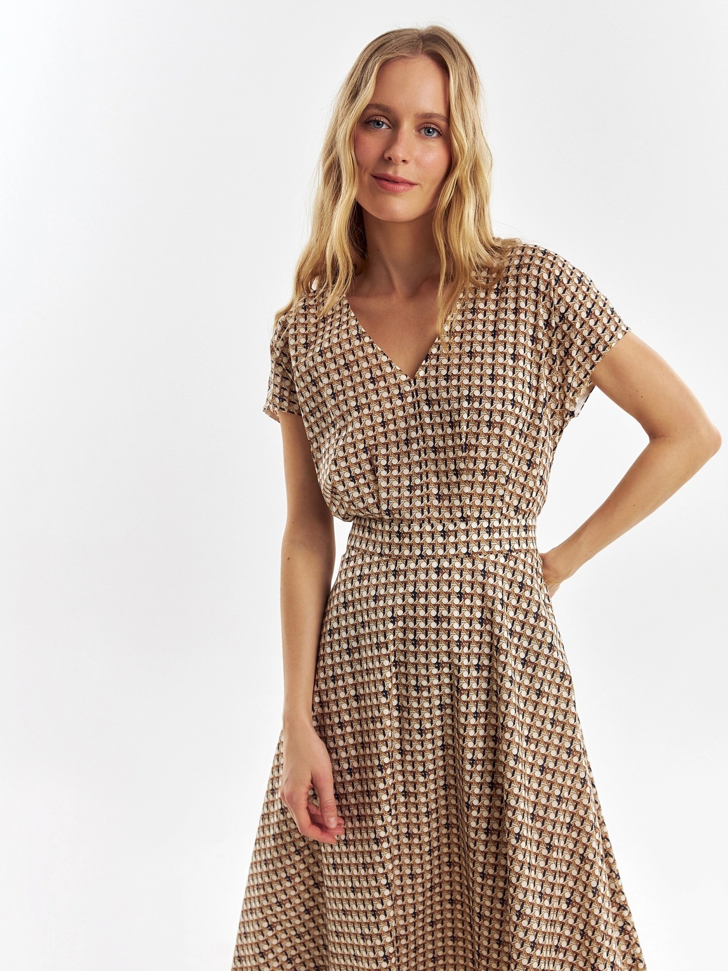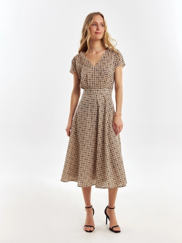 Приталенное платье из принтованной хлопковой ткани с V-образным вырезом и рукавом кимоно. Платье отрезное по талии, лиф со сборкой. Юбка разведенная трапеция на подкладке. Потайная молния и пуговица в боковом шве.