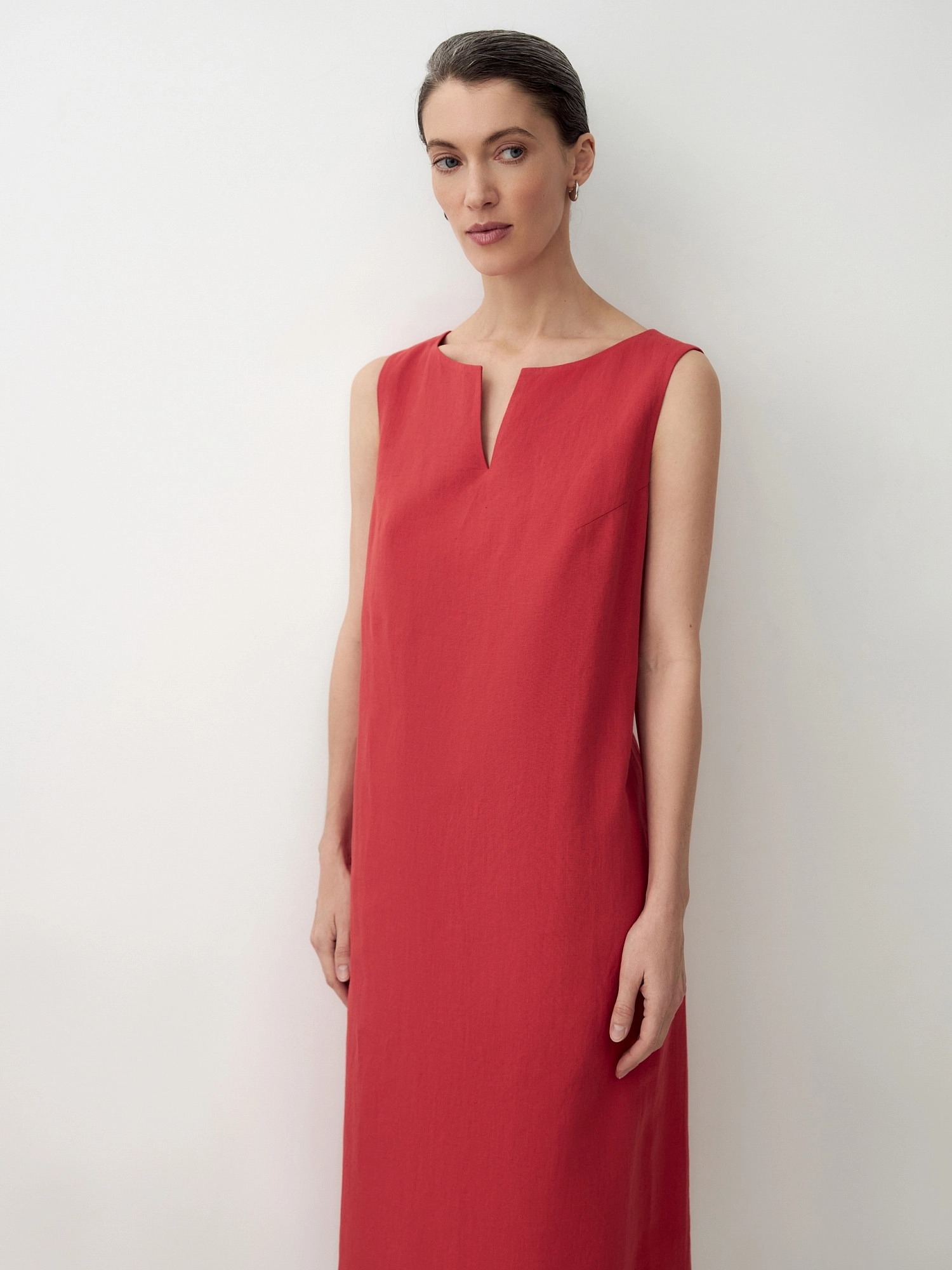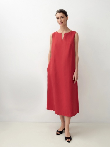 Платье трапеция из льняной ткани с круглой горловиной и небольшим разрезом по переду. В боковых швах потайные карманы.