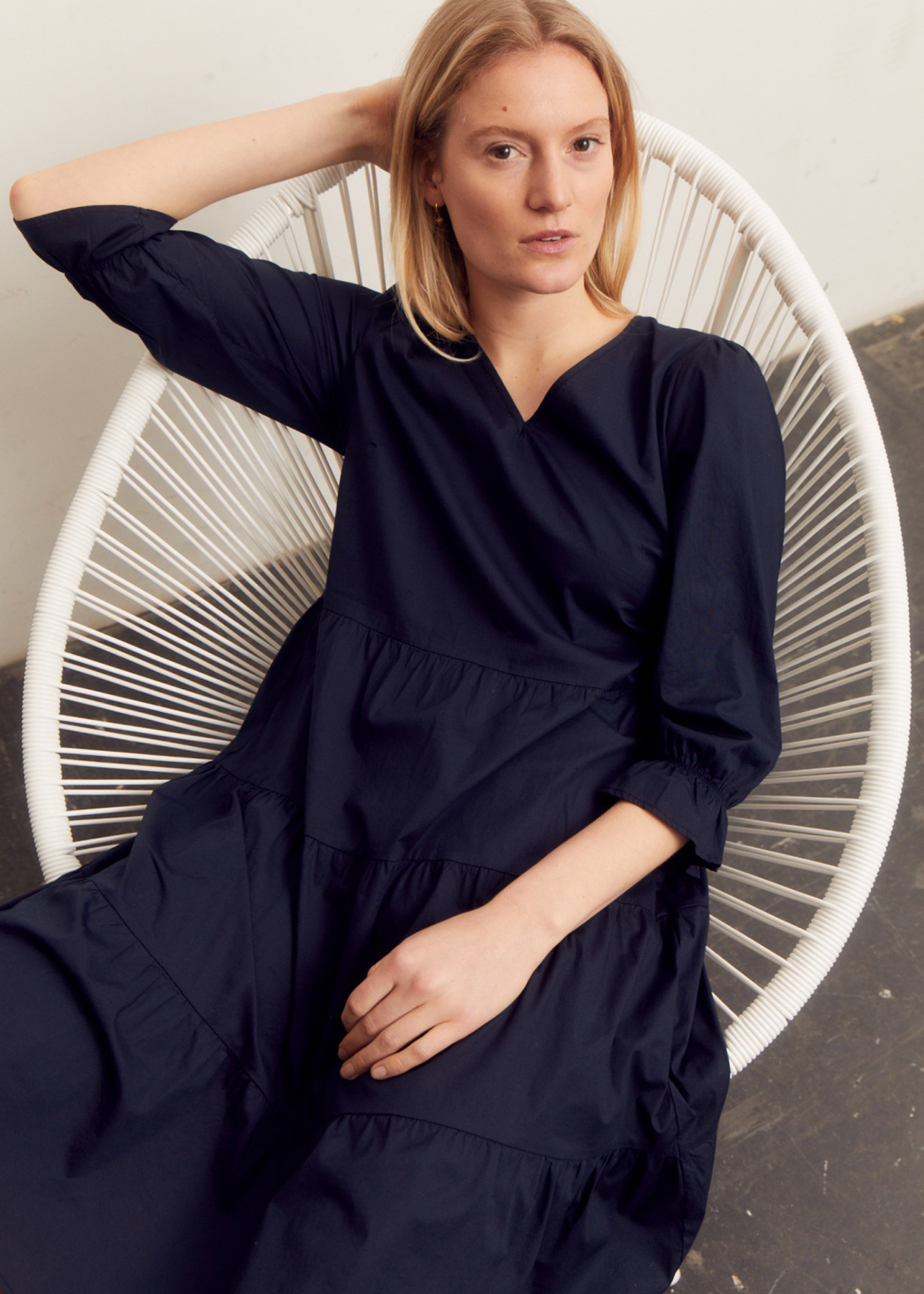 Однотонное платье свободного кроя с рельефами подойдет как для делового, так и для повседневного образа. Носите его с кроссовками, сандалиями или каблуком в зависимости от случая. V-образный вырез горловины. Втачной рукав ¾ с оборками.