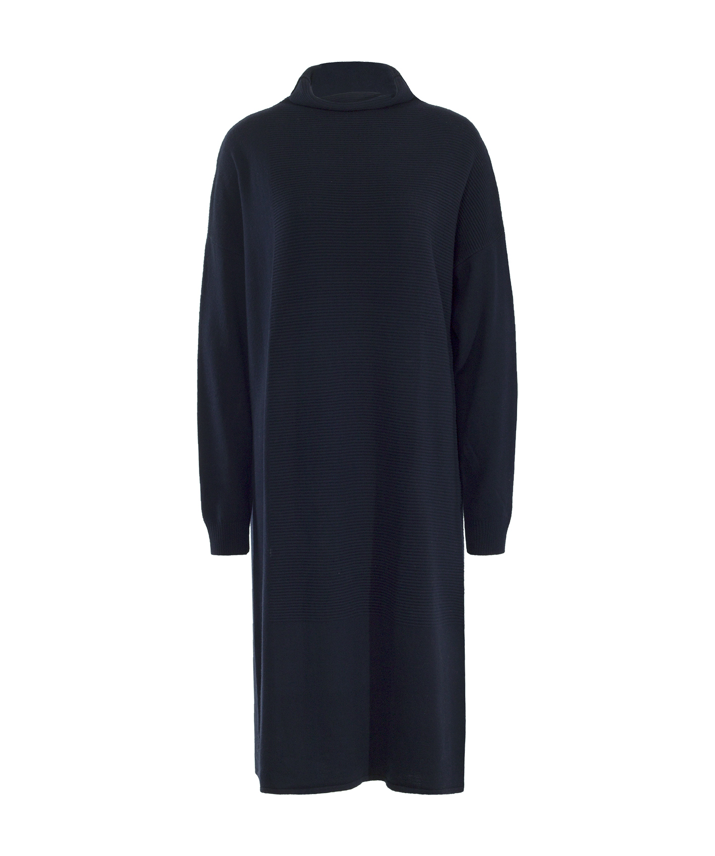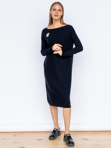 Теплое шерстяное платье свободного покроя. Длинный рукав со спущенным плечом. Воротник-хомут. Сочетание различных типов машинной вязки по переду изделия вносит разнообразие в минималистичный дизайн.
