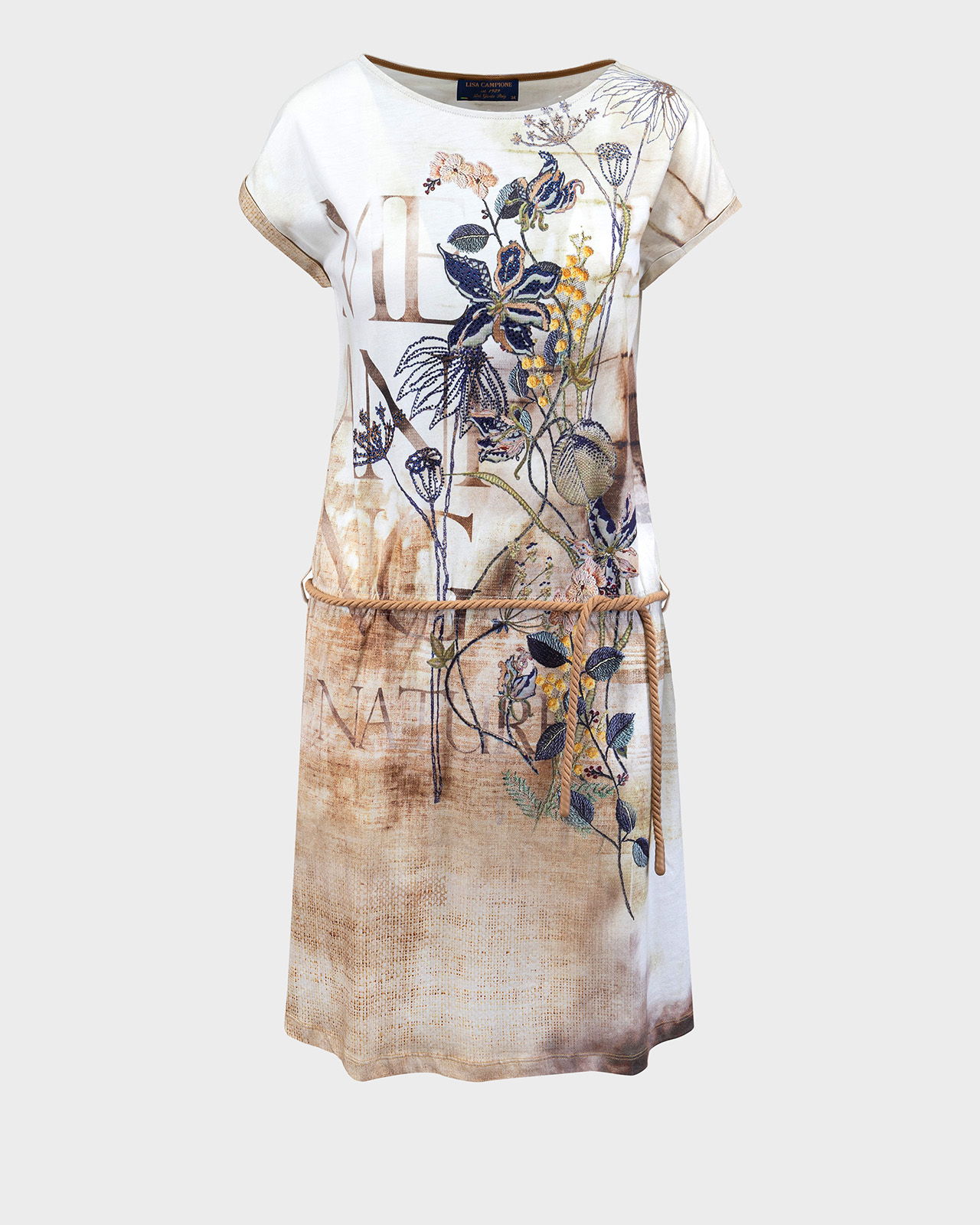 Платье прямого кроя длины мнини с цветочным принтом. Цельнокроеный короткий рукав, овальный вырез горловины. В комплекте идет пояс-шнурок.