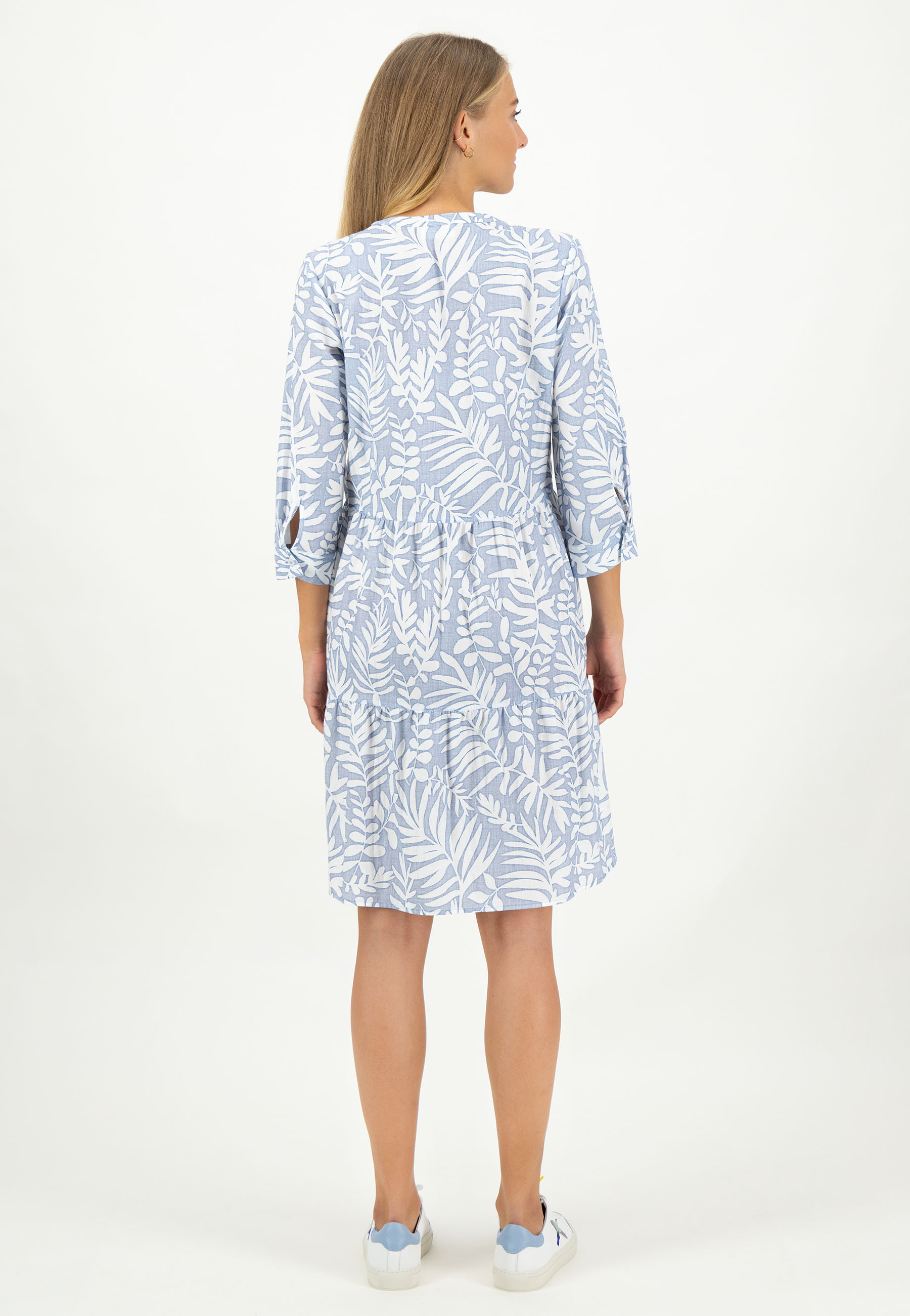Хлопковое платье до колена с планкой на половину пуговицы и игривыми деталями.