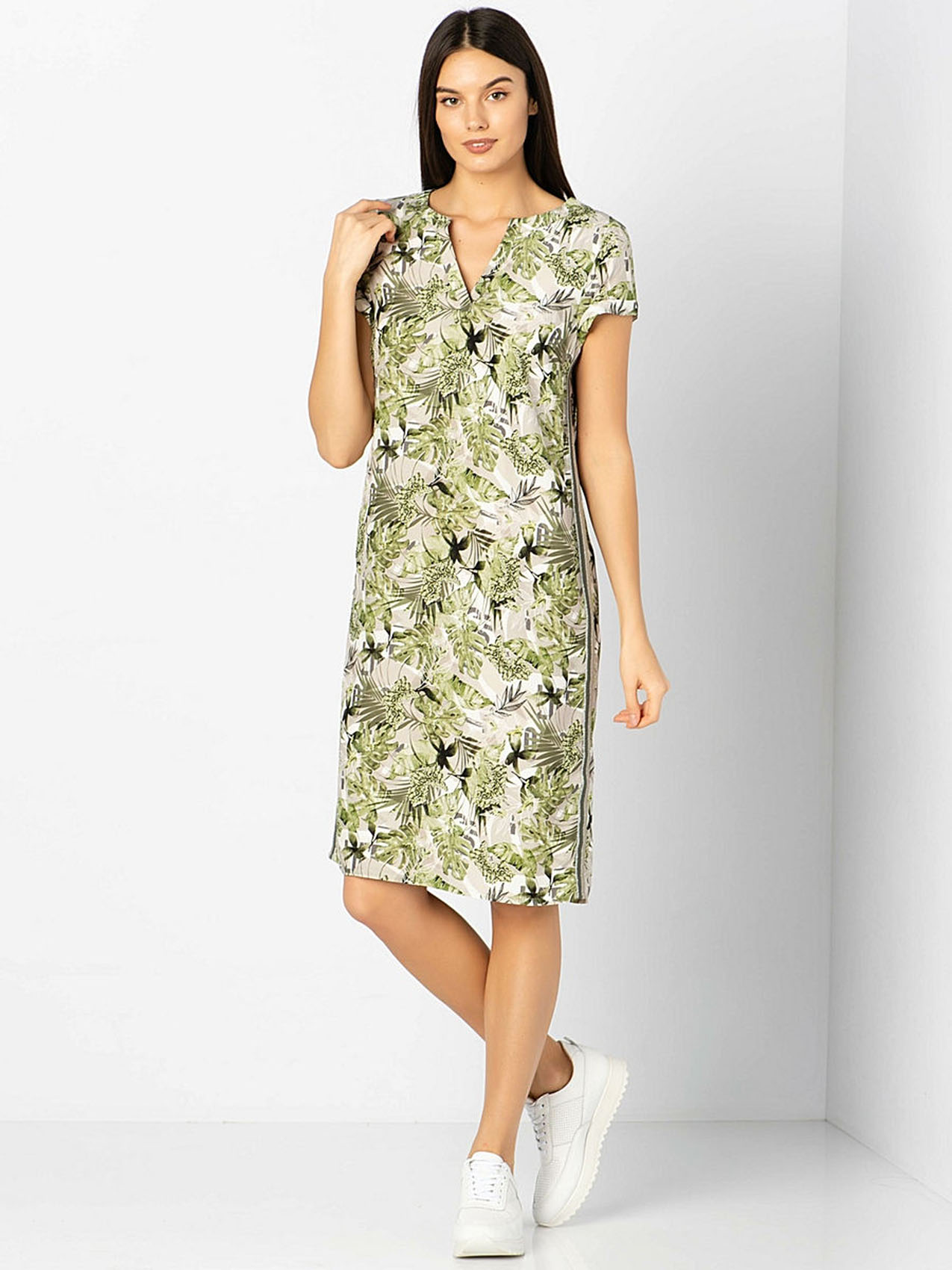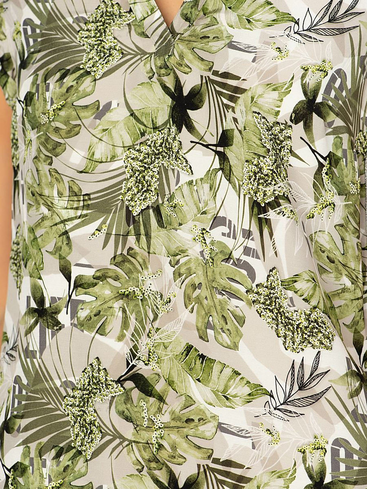• слегка приталенный силуэт • короткие рукава • трендовый принт с тропическими мотивами • декоративная лента по боковым швам • приятный к телу вискозный материал • длина изделия по спинке: 80 см.