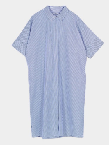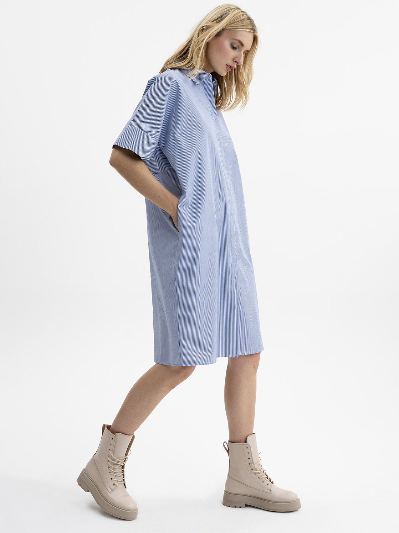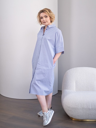 Хлопковое платье-рубашка свободного кроя. Длина миди. Отложной рубашечный воротник. Короткий втачной рукав с отворотом. Застежка на пуговицы.