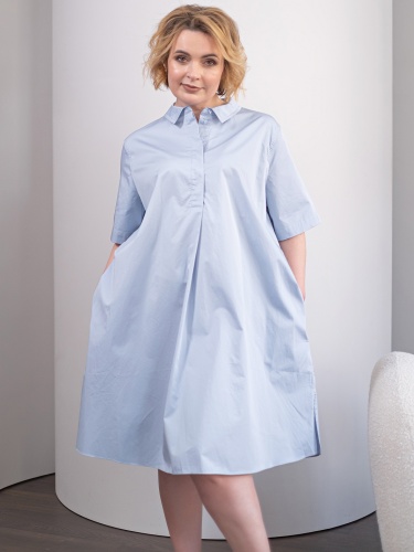 Хлопковое платье-рубашка свободного кроя. Длина миди. Отложной рубашечный воротник. Короткий втачной рукав с отворотом. Застежка на пуговицы.