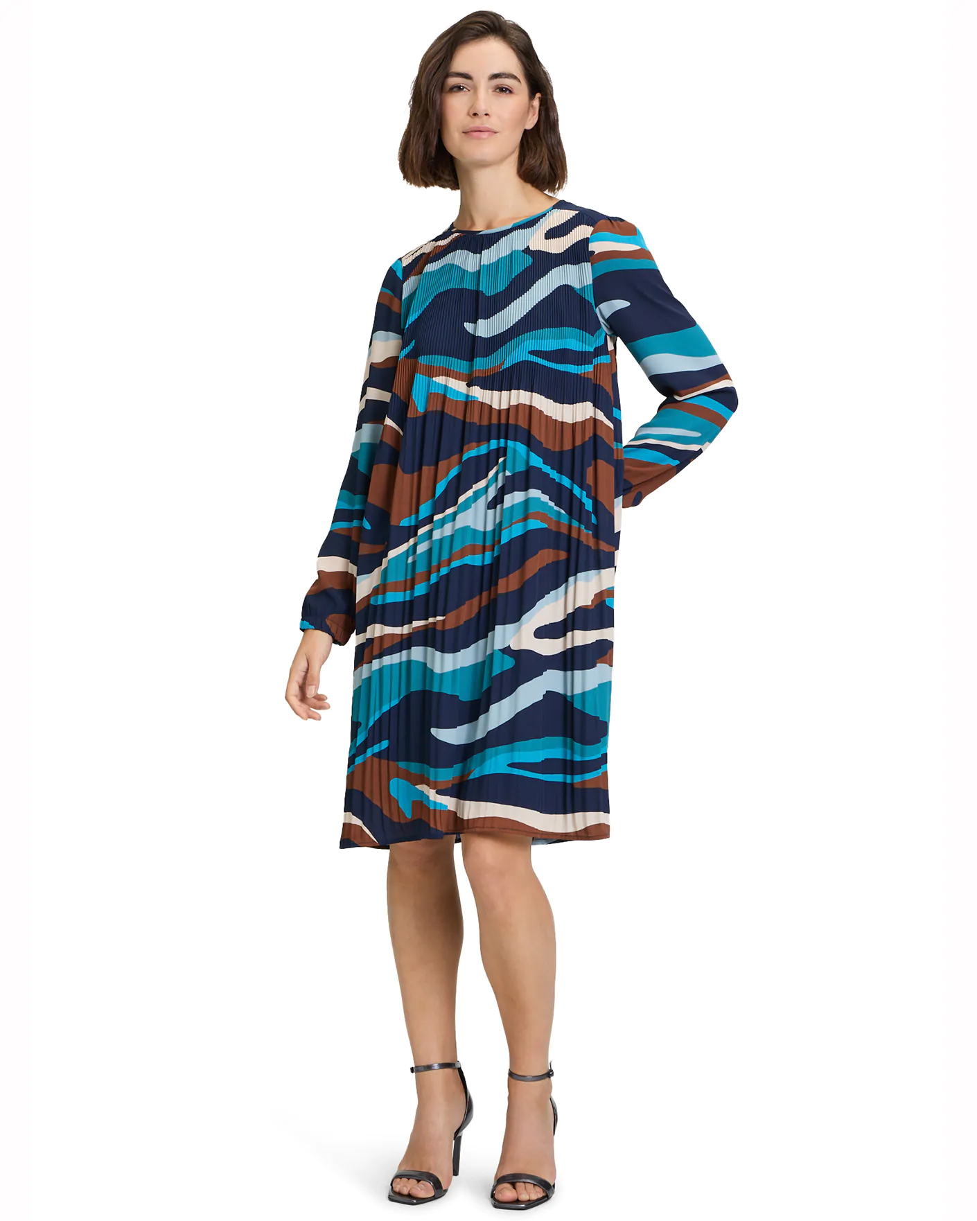Свободное яркое платье Betty Barclay сине-коричневого цвета в абстрактный принт. Плиссированная ткань на спинке и переде, круглым вырез горловины, застежка сзади на пуговице, длинные рукава с манжетами на резинке в складку.