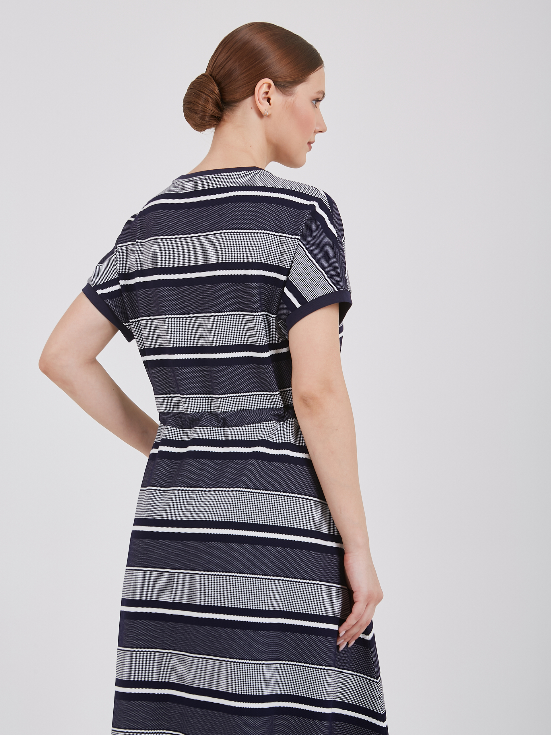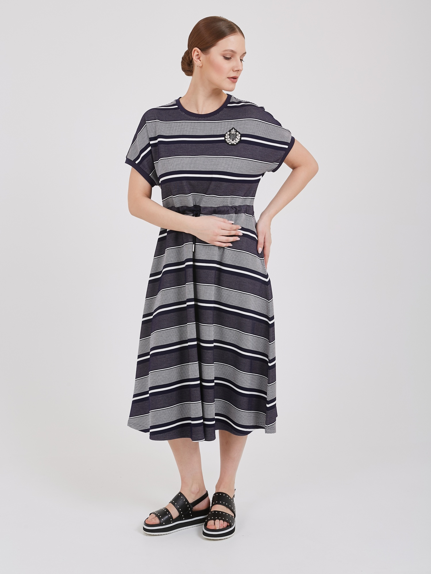 Платье имеет свободный крой с короткими рукавами и яркий полосатый рисунок в темных тонах, создающий стильный и комфортный образ. Дополнено декоративной брошью на груди и карманами, оно идеально подходит для повседневной носки. Коллекция Весна-Лето 2025. Капсула "Самарканд". Параметры модели: 95-64-101, рост 175, размер 44-46