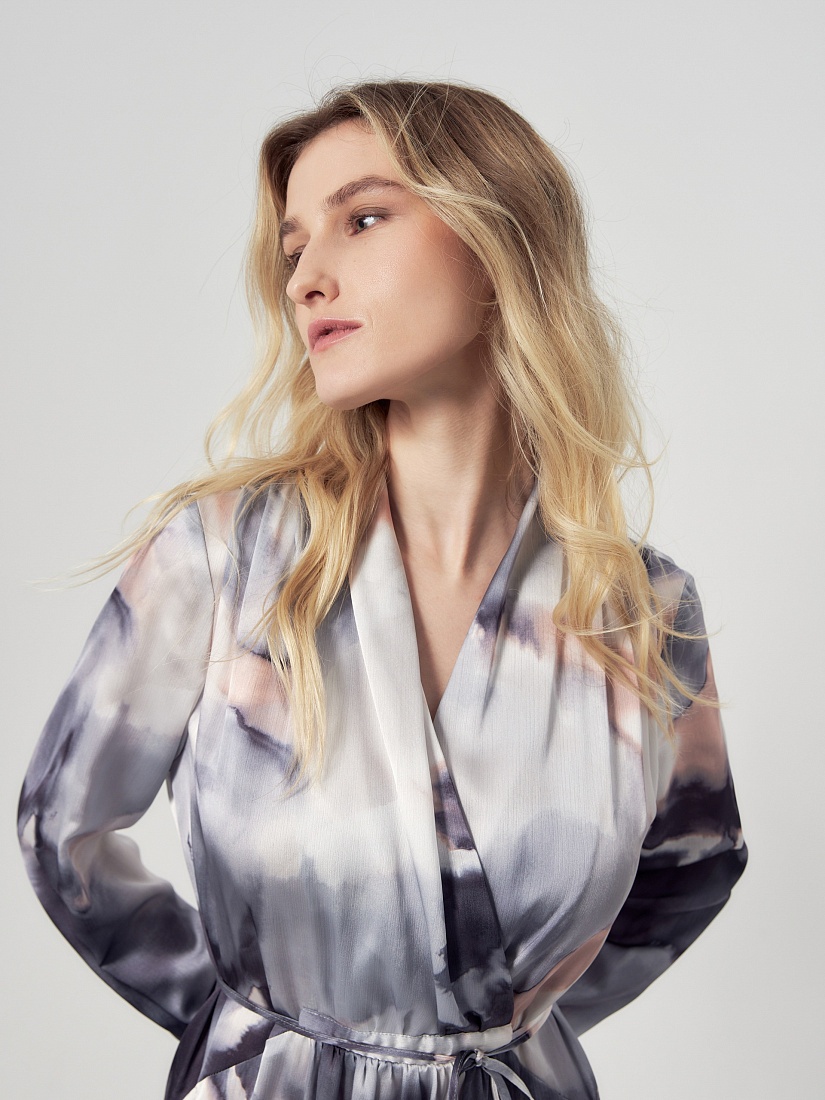 Свободное платье макси из атласной ткани в романтичном принте, по плечам складки, горловина с V-образным вырезом на запах. По переду есть кулиса и тонкая длиная завязка из основной ткани, для придания приталенного силуэта. По переду карманы. Рукав классический на манжете с пуговицей. В комплект входит нижняя юбка из подкладки.