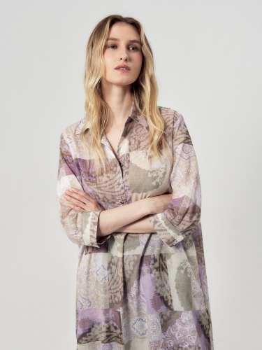 Прямое платье блузочного силуэта с отложным воротником и укороченной планкой на пуговицах. Платье выполнено из тонкой хлопковой ткани с этническим принтом в технике пэчворк. Классический втачной рукав длиной 3/4 на манжете с декоративной тесьмой мониль. Платье с разрезами по бокам.