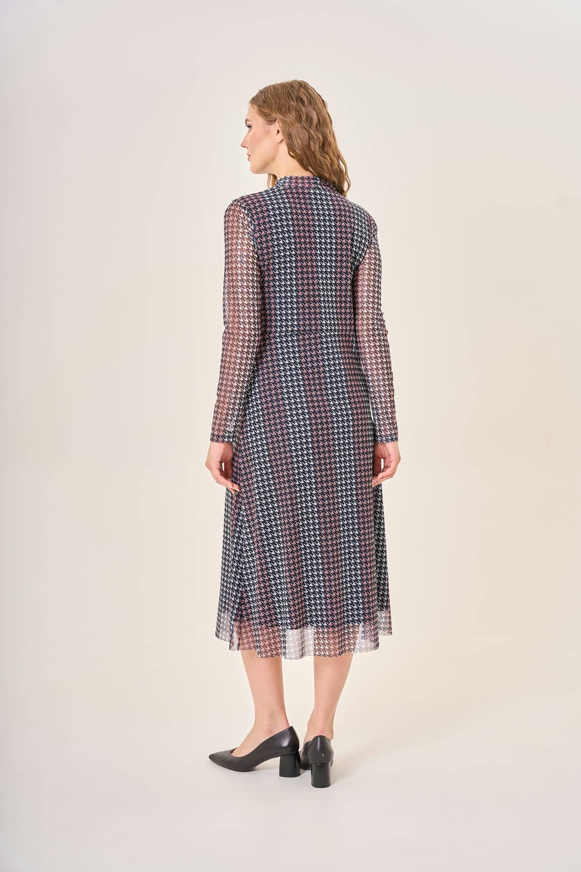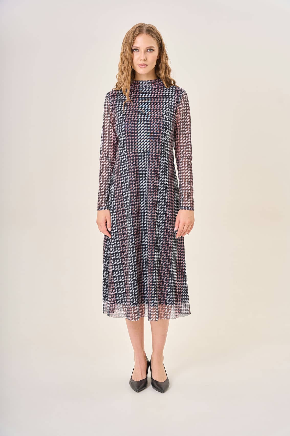 Платье с длинными рукавами и высоким воротником. Элегантный узор "гусиная лапка" в оттенках темно-синего, розового и белого придает образу изысканность и утонченность. Длина платья до середины икры создает гармоничный и привлекательный силуэт. Легкий струящийся материал приятно облегает фигуру, делая этот наряд идеальным выбором для особых случаев и романтических вечеров.