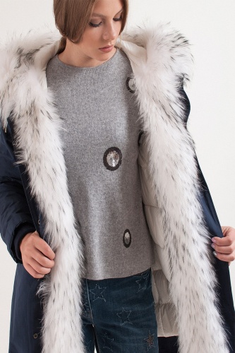 Теплое пуховое пальто. Плотная ткань верха. Прямой покрой, удлиненная спинка, кулиска на талии. Карманы пальто на клапанах. Кулиска по низу изделия. Оторочка капюшона из натурального меха енота.
