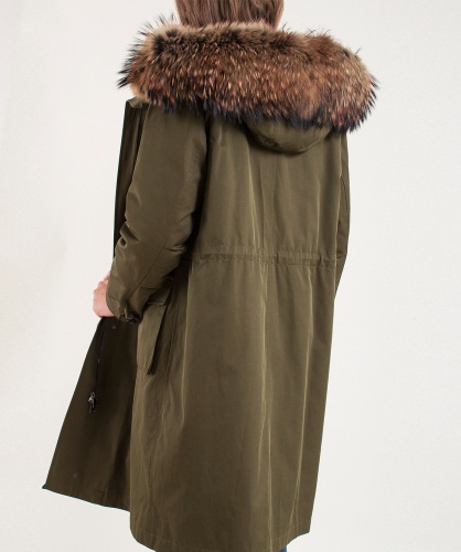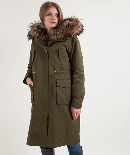 Теплая пихора, подкладка из меха кролика. Плотная ткань верха. Прямой покрой, кулиска на талии. Карманы на клапанах. Рукава оформлены патой на пуговице. Оторочка капюшона из натурального меха енота.