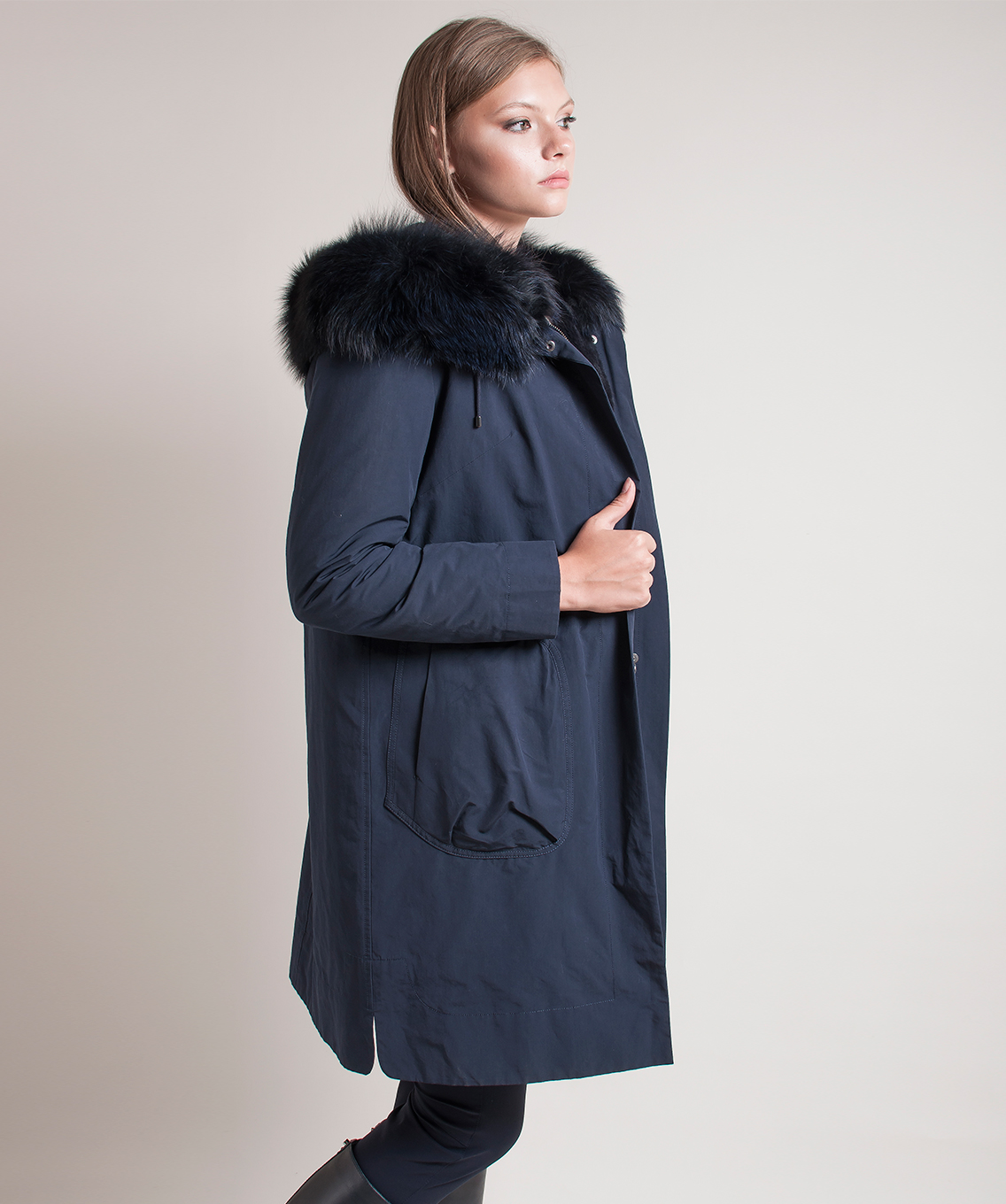 Теплая пихора на подкладке из меха кролика. Плотная ткань верха. Прямой покрой, кулиска с завышенной линией талии. Накладные карманы. Разрезы по бокам. Оторочка капюшона из натурального лисьего меха.