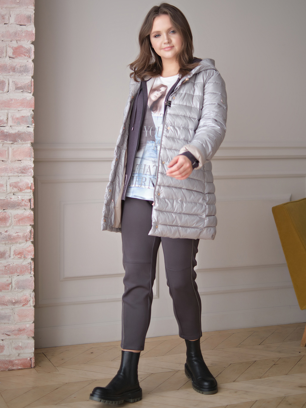Стеганая однотонная куртка длиной до середины бедра. Глубокий капюшон, боковые карманы на молнии, втачной рукав полной длины. Представлена в синем и серебристом цвете.