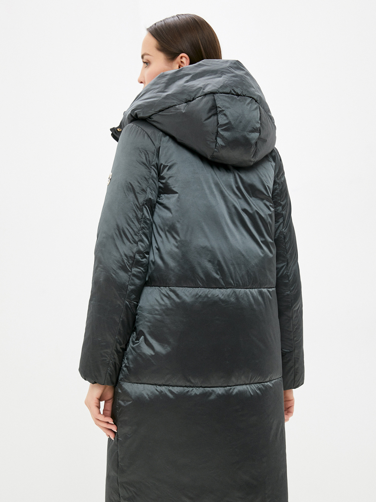 Стеганое пальто с наполнителем пух-перо. Застежка на молнии, ветрозащитный планка на кнопках, несъемный капюшон, боковые прорезные карманы с листочкой. Пальто хорошо защитит от холода и дополнит образ в городском стиле.