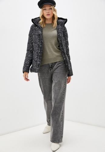 Стеганая куртка без капюшона с синтепоновым наполнителем. Стильный принт по всей поверхности изделия. Прямой силуэт универсален для любого типа фигуры. Воротник-стойка отделан искуственным мутоном. Застежка на скрытую молнию и кнопки. По бокам проперзные карманы с листочкой на кнопке.
