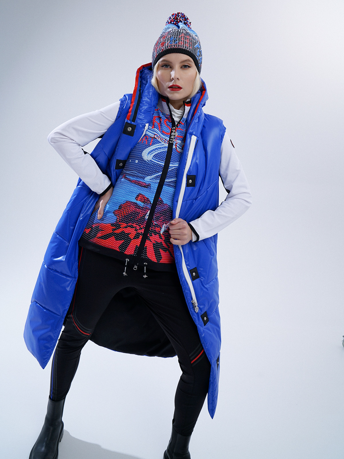 Удлиненный стеганый жилет ярко-синего цвета – теплый и стильный элемент аутфита. Подойдет для образов в спортивном или повседневном стиле, а также для образов спорт-шик. Застежка на контрастную молнию и клепки. Объемный капюшон защищает от ветра.