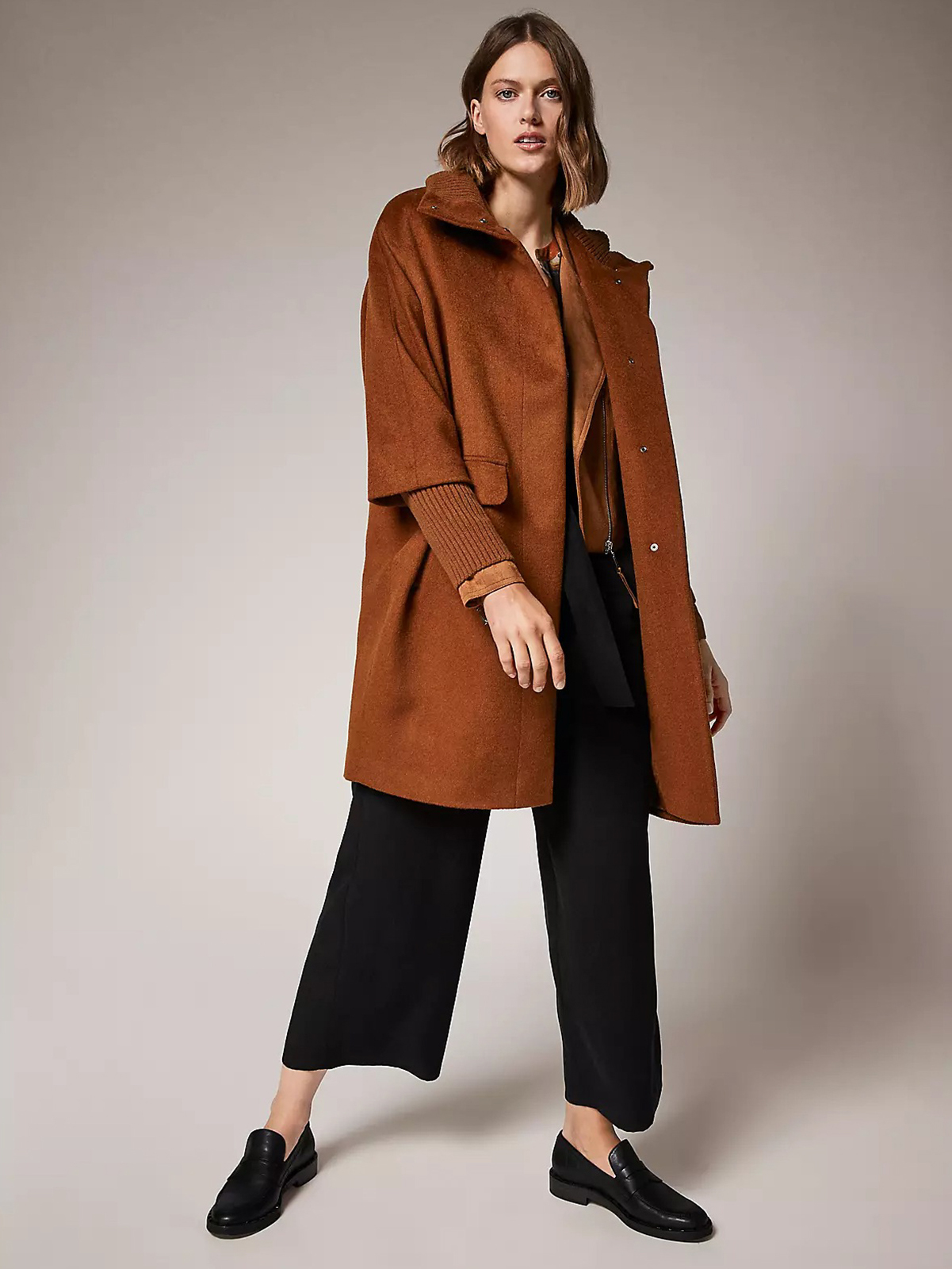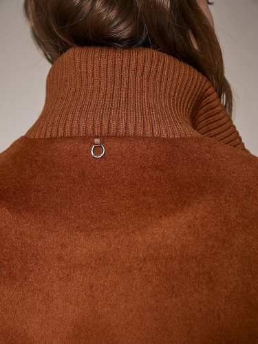 Однотонное драповое демисезонное пальто коричневого оттенка. Материал из смесовой шерсти. Супатная застежка на кнопки. Длинные втачные рукава с широкими трикотажными манжетами в рубчик. Высокий воротник стойка в рубчик. Боковые карманы с клапанами.