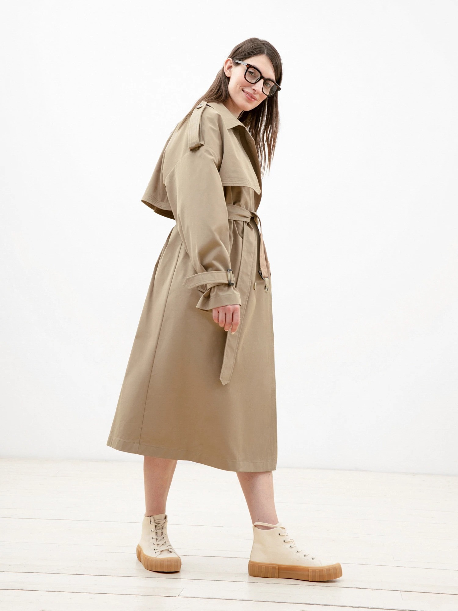 Двубортный тренч прямого силуэта из плащевой ткани бежевого цвета. Классический крой и длина миди делают эту модель универсальным дополнением образов в любом стиле. Рукав рубашечный, английский воротник, с возможностью застегивания на верхнюю пуговицу,чтобы закрыть зону декольте и не только изменить образ, но и предотвратить попадание ветра