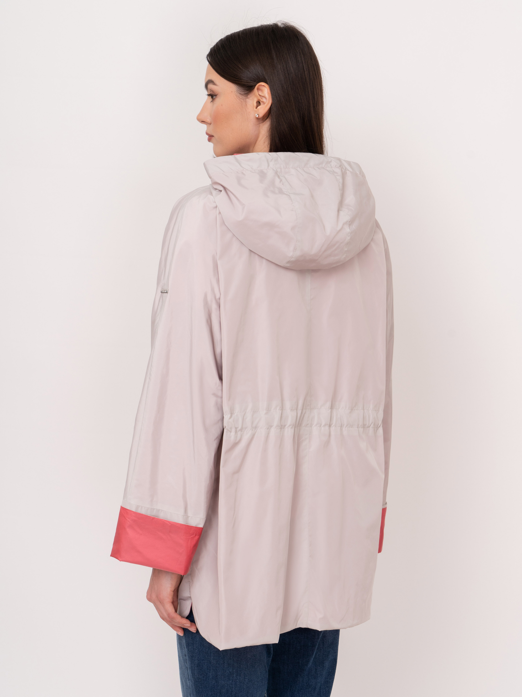 На сайте указаны российские размеры. Легкая двусторонняя куртка розового цвета, которую можно носить с обеих сторон. 2 боковых кармана на молнии. Регулировка талии кулиской. Рост модели: 175 см. Длина куртки: 76 см.