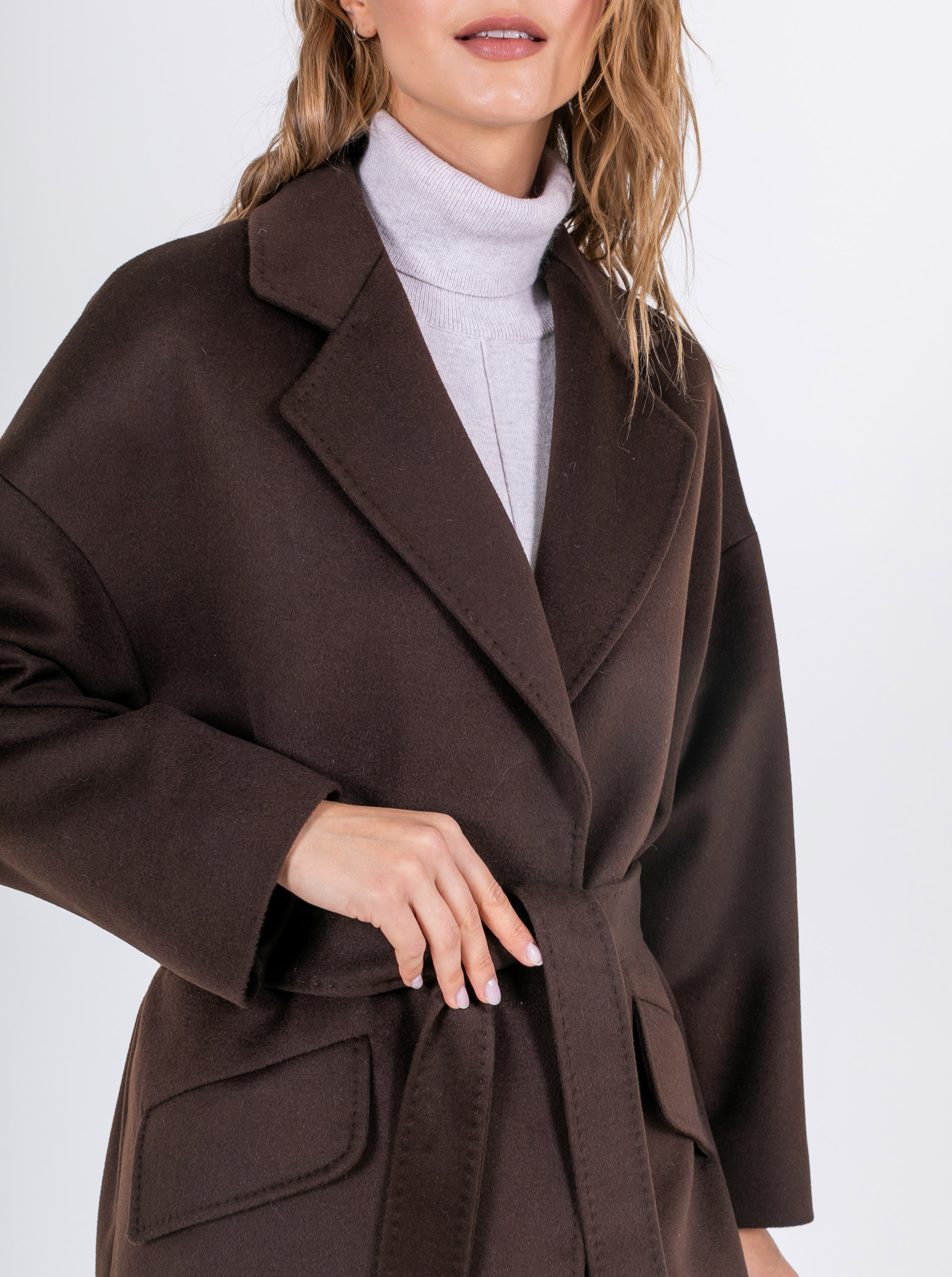 На сайте указаны российские размеры. Свободное пальто классического кроя из 100% шерсти. Свободный рукав, спущенное плечо, скрытые карманы, английский воротник. Модель с закруглёнными углами снизу. С поясом. Рост модели: 174 см