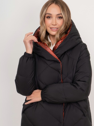 На сайте указаны российские размеры. Двустороннее утепленное черно-терракотовое пальто на молнии и кнопках, с длинным рукавом, с прорезными карманами, с трикотажными манжетами, с боковыми разрезами на кнопках. Рост модели: 175 см. Длина пальто: 119 см.