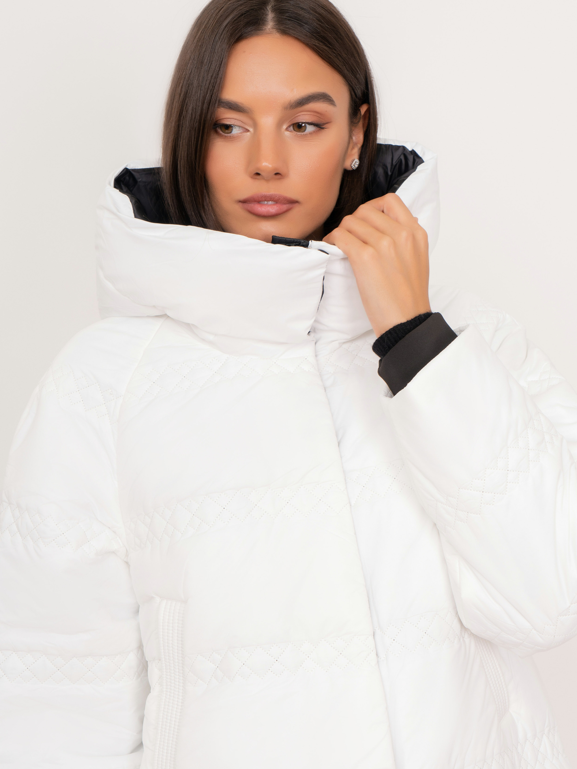 На сайте указаны российские размеры. Прямая утепленная белая куртка на молнии и кнопках, с капюшоном, с прорезными карманами. Рост модели: 175 см. Длина куртки: 80 см.
