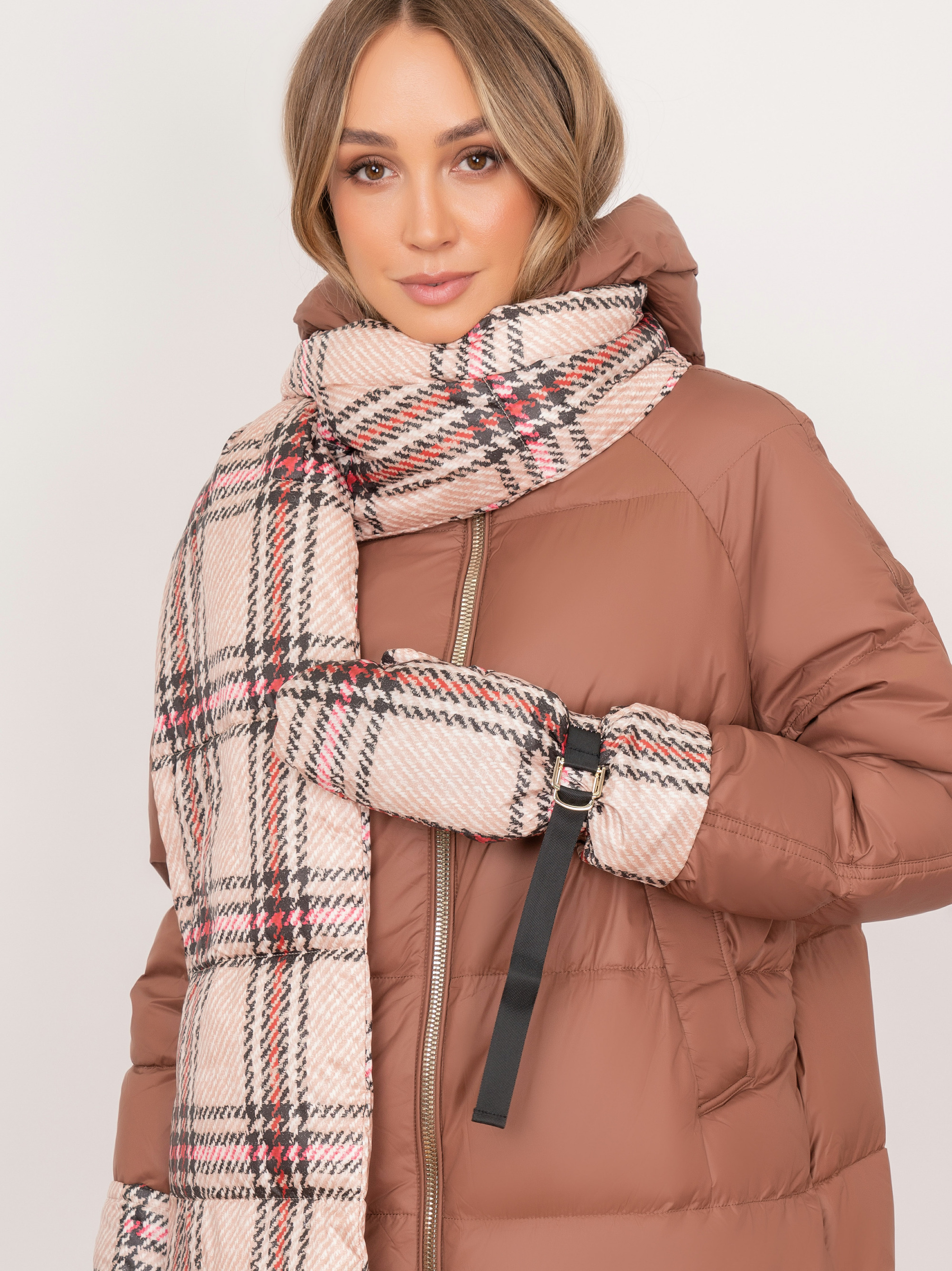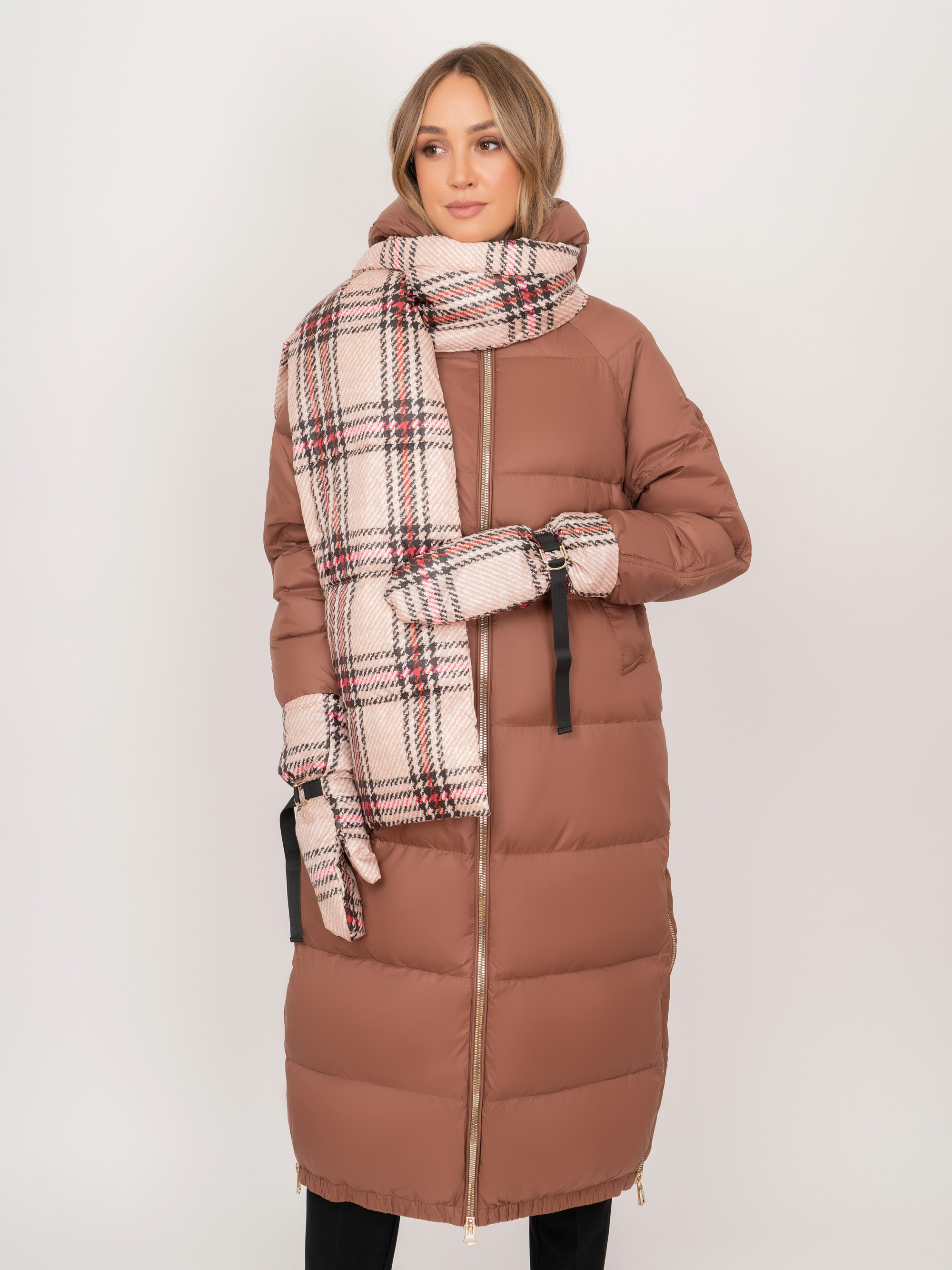 На сайте указаны российские размеры. Прямое утепленное пальто на молнии, с капюшоном, с прорезными карманами, с боковыми разрезами на молнии. В комплект входит дутый теплый бежевый шарф и варежки из плащевой ткани в яркую клетку. Длина по спинке: 115 см. Рост модели: 175 см.