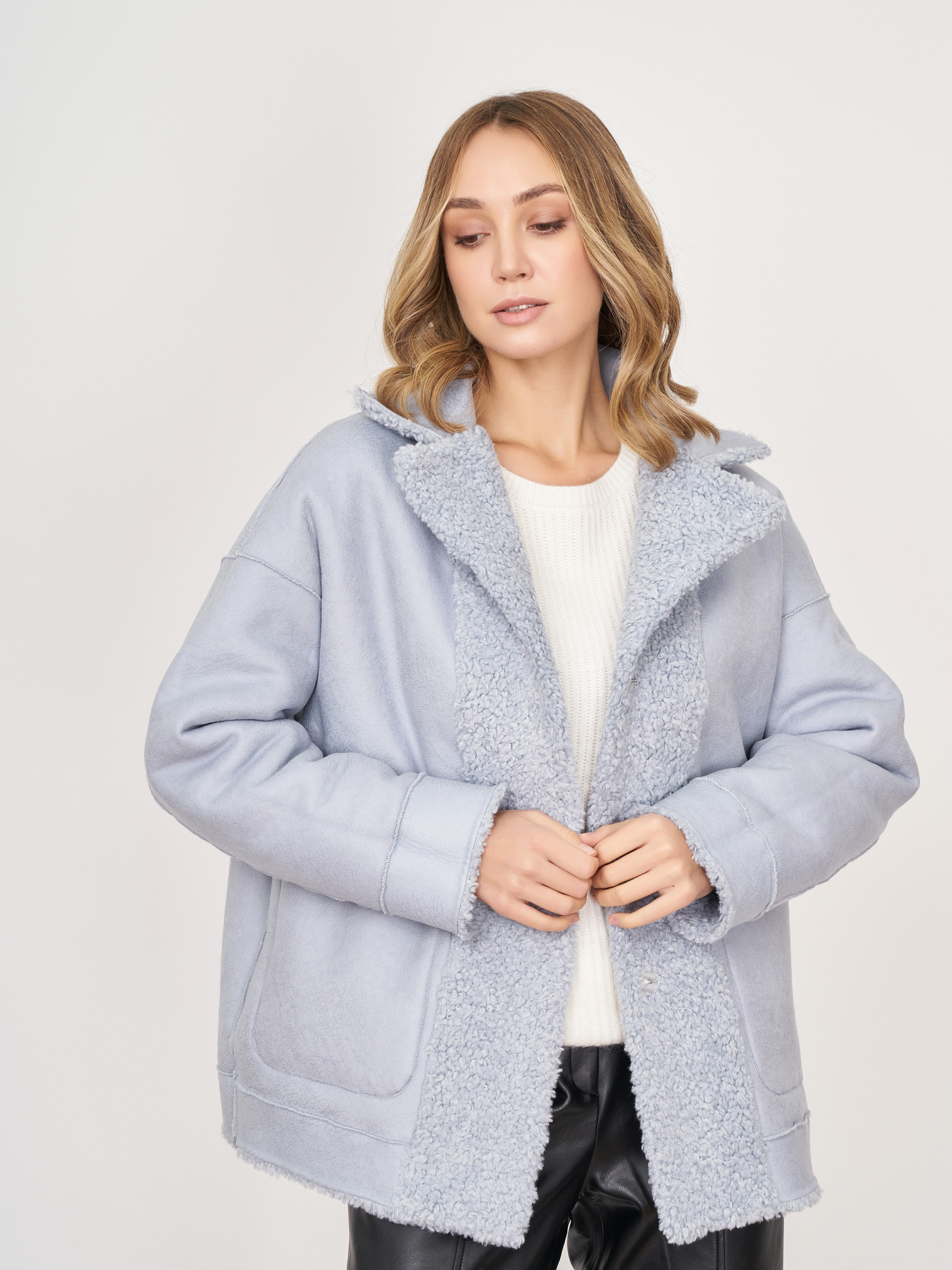 На сайте указаны российские размеры. Прямая двусторонная куртка из искусственного меха на кнопках, с отложным воротником, накладными карманами и с длинным рукавом. Представлена в голубом и хаки цветах. Длина по спинке: 70 см Рост модели: 175 см