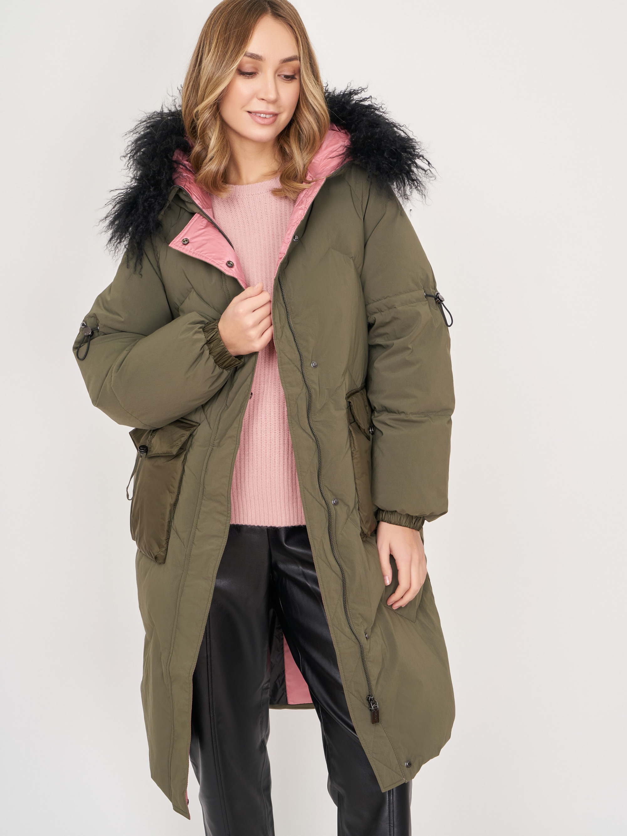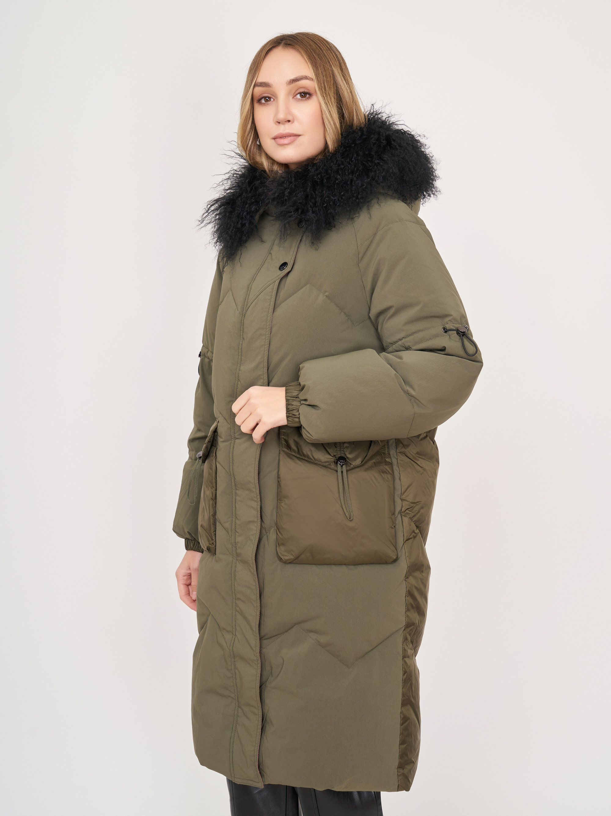 На сайте указаны российские размеры. Прямое утепленное хаки пальто на молнии и кнопках, с несъемным капюшоном, со съемной опушкой, с длинным рукавом с кулиской, с накладными карманами. Длина по спинке: 99 см. Рост модели: 175 см.