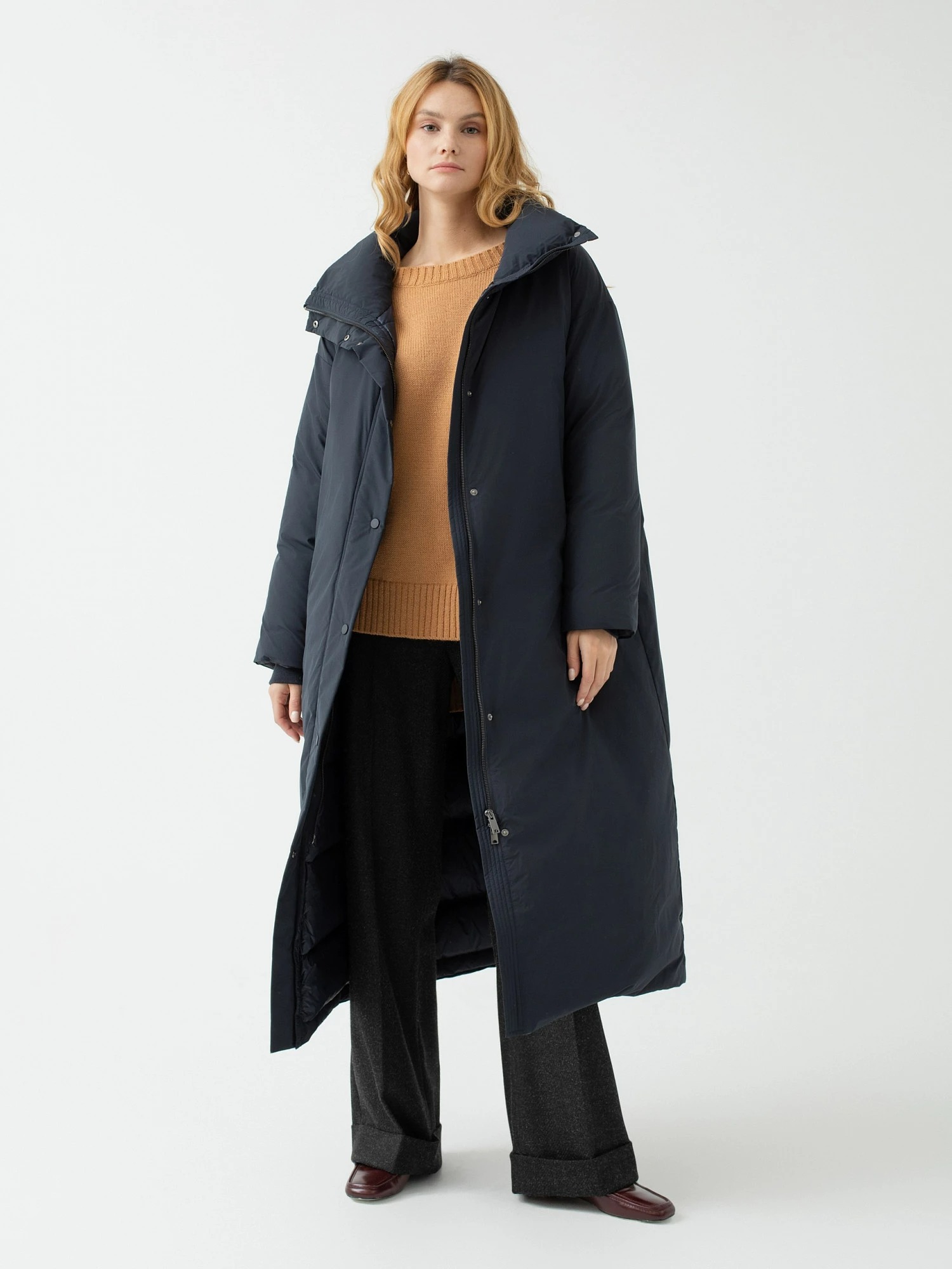 На сайте указаны российские размеры. Утепленное пальто прямого силуэта из плащевой ткани темно-синего цвета. Пальто произведено из премиальной плащевой ткани. В качестве утеплителя 90% пух и 10% перо. Комфортный рубашечный рукав, высокий воротник-стойка, что позволяет не использовать дополнительные теплые аксессуары, и при этом надежно сохраняет тепло. По низу рукава вязаная манжета в цвет основной ткани для дополнительного тепла. Длина пальто миди. Застежка на молнию и ряд потайных кнопок. В качестве дополнительного декора пояс-резинка на стильную металлическую пряжку, который дает возможность подчеркнуть силуэт. Внутренняя сторона пальто со стильной стежкой, которая переходит на лицевую сторону. Рост модели на фото - 175 см. Длина изделия - 123 см.