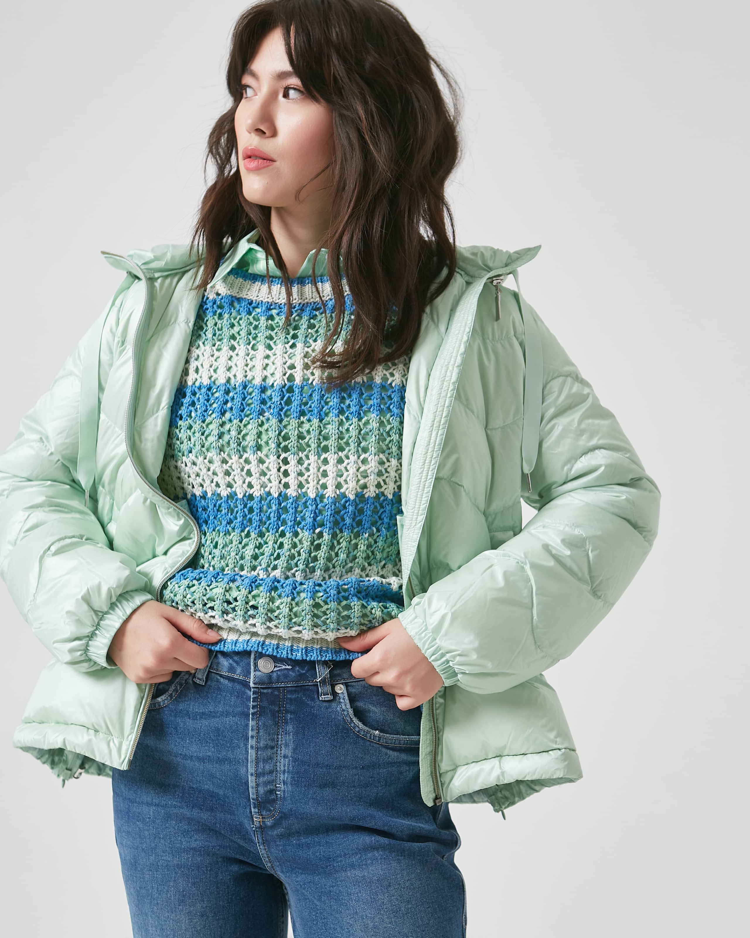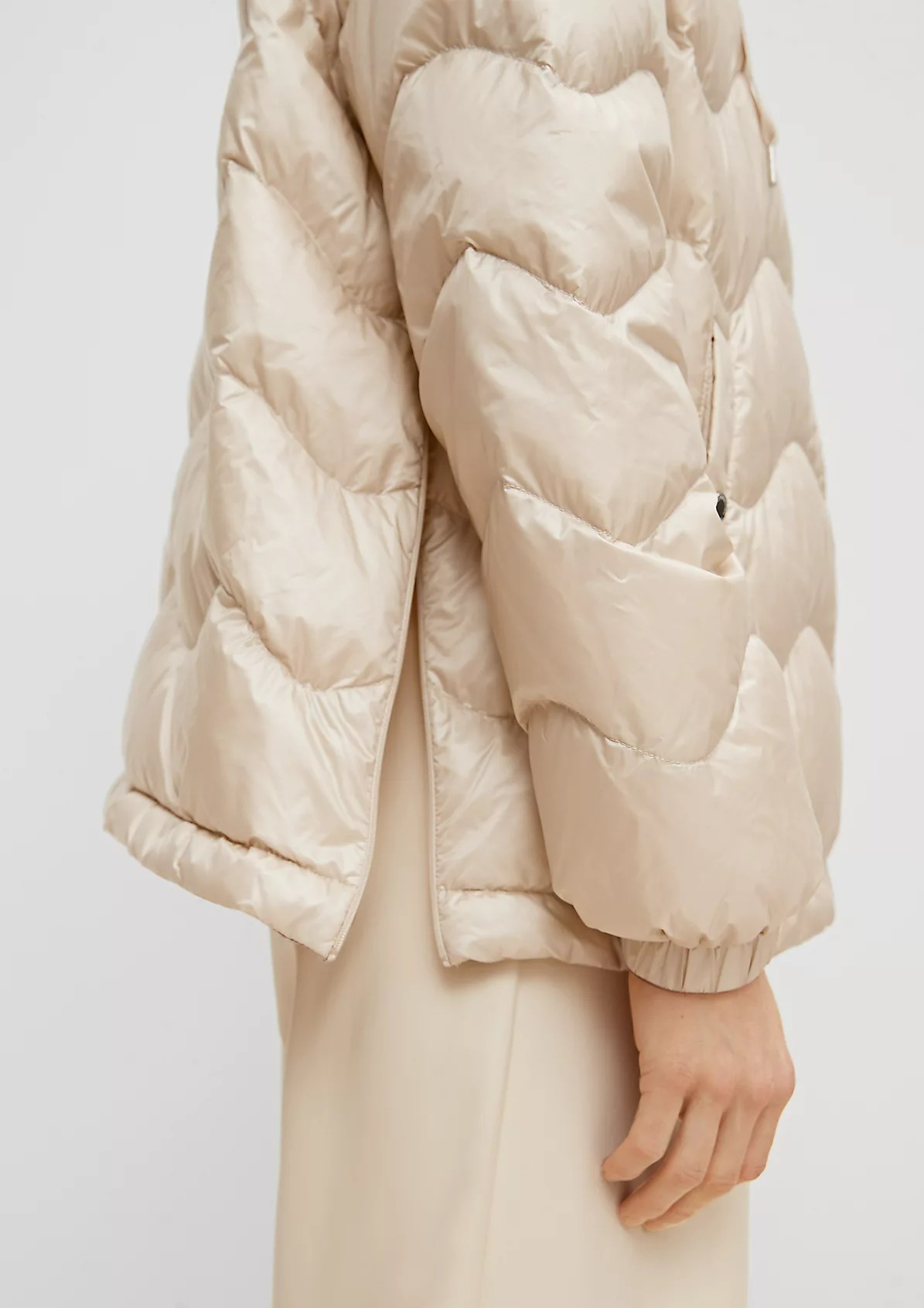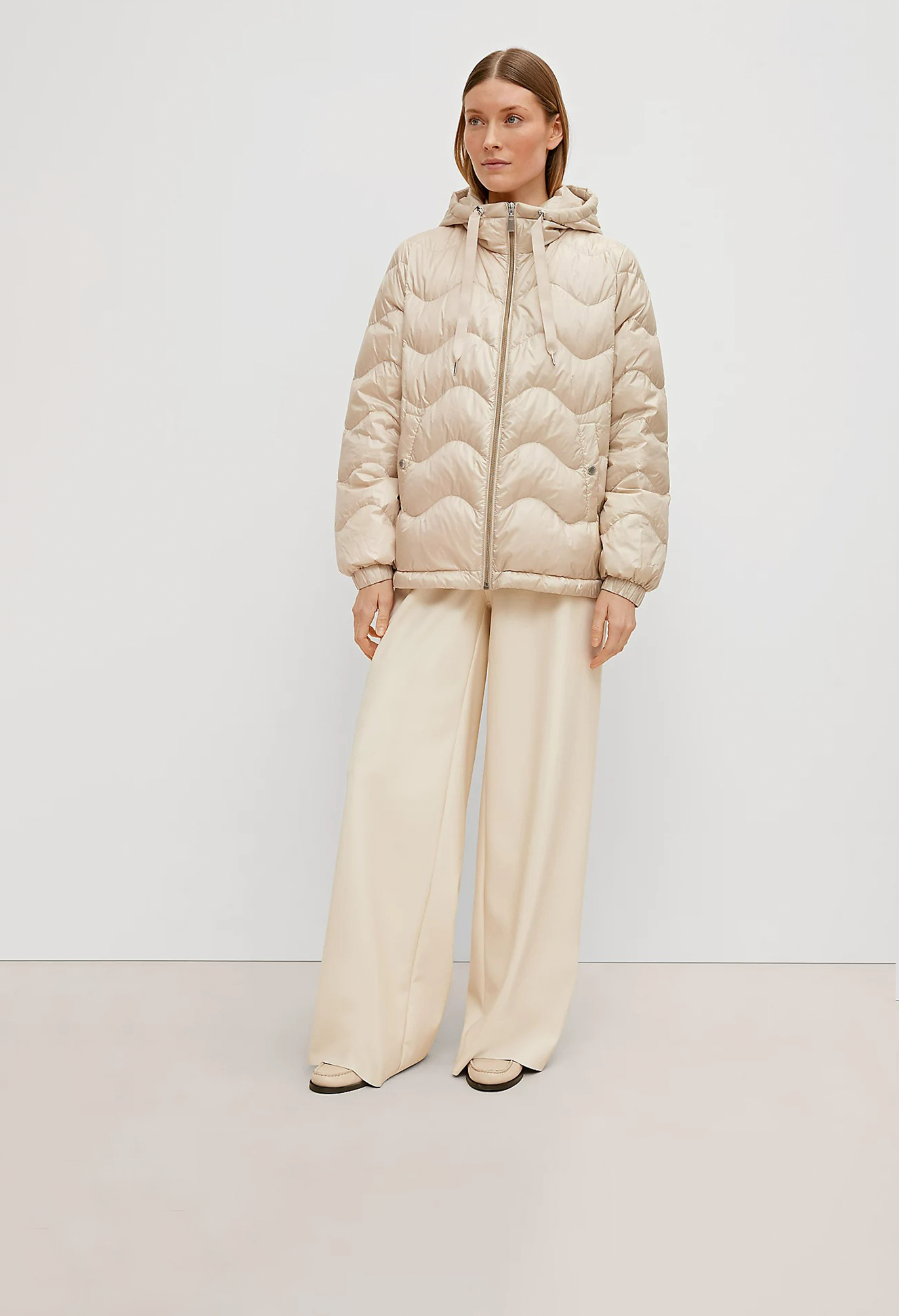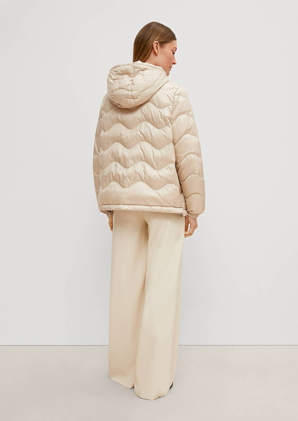 На сайте указаны российские размеры. Короткая куртка с капюшоном и стеганой отделкой. Подкладка: подкладка из тафты. Наполнитель: пух и перья. Длинные рукава, эластичные манжеты. Длина спины: 64 см в размере 42 Рост модели: 178 см