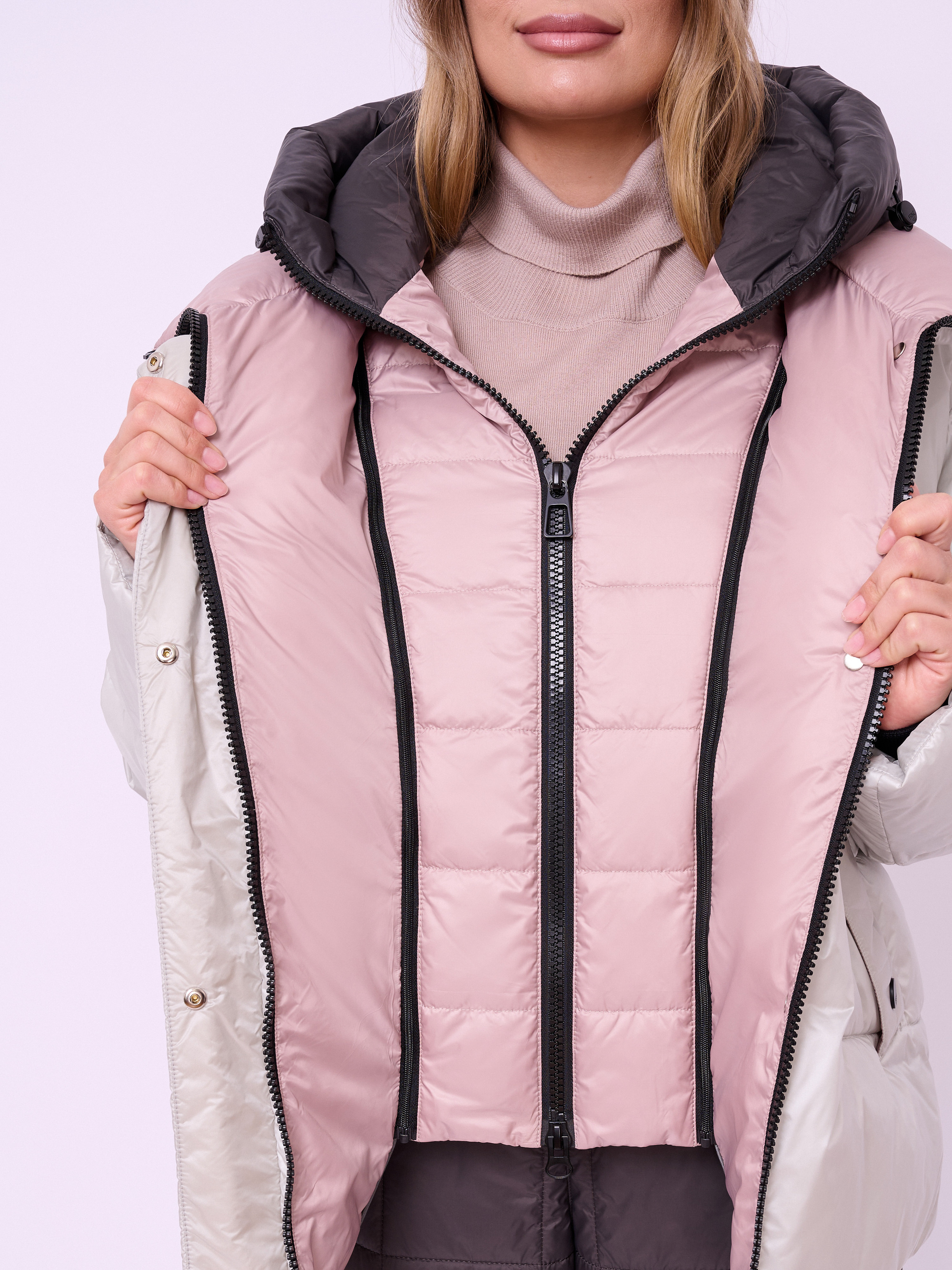Куртка утпеленная стеганая на молнии и кнопках со съемной манишкой с капюшоном на кулиске, без опушки, с длинными рукавами с трикотажными манжетами, прорезными карманами на кнопках и кулиской по низу.