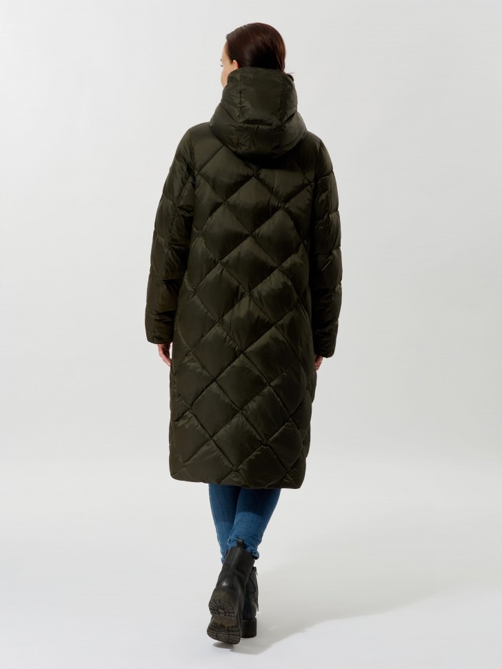 Пальто женское прямого силуэта. Выполнено из водоотталкивающей ткани с эффектом металлик. Застежка борта на молнии и потайных кнопках, закрытых планкой Карманы листочки, втачной капюшон, по низу рукава внутренний трикотажный манжет.