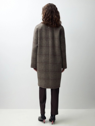 Двубортное пальто с характерным силуэтом "удлиненный кокон" - универсальная вещь для любого гардероба. Комфортный рубашечный рукав со спущенным плечом не стесняет движений. Пальто имеет классический английский воротник, по бокам расположены два глубоких функциональных кармана с зауженными листочками. Пальто модной длины до колена с застежкой на два ряда крупных пуговиц с мягким велюровым покрытием. Спинка имеет дополнительное утепление. Пальто выполнено из пальтовой шерстяной ткани коричневого цвета с модным принтом в клетку.