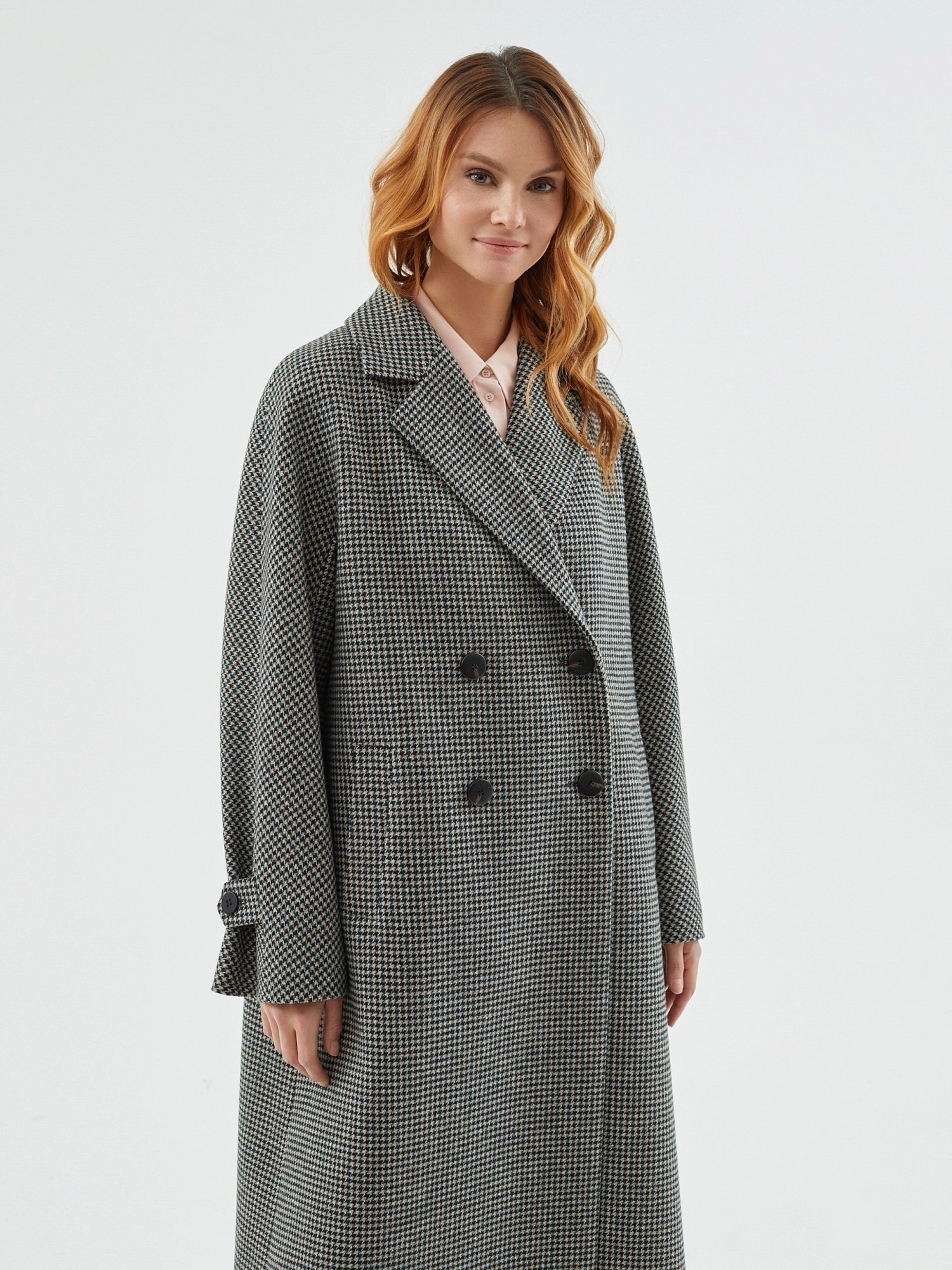 Объемное пальто прямого силуэта из шерстяной ткани в черно-изумрудном оттенке с принтом пье-де-пуль. Классический английский воротник приобретает новую современную форму и стремится к застежке пальто, что зрительно вытягивает силуэт. Пальто имеет мягкую линию рукава-кимоно, по низу которого рсположена встречная складка с фиксацией на пату для регулировки объема рукава. Длина пальто ниже колена, в среднем шве спинки располагается высокая шлица. Застегивается изделие на ряд крупных темных стильных пуговиц. В качестве нового модного декоративного и функционального элемента к пальто прилагается съемный капюшон с удлиненной манишкой в изумрудном оттенке из плащевой ткани с водонепроницаемым покрытием. Такой капюшон также можно использовать отдельно, как самостоятельное изделие. Манишка капюшона очень длиная, что может заменить полноценный жилет, а на талии располагаются застежки-фастексы, надежно фиксирующие изделие.