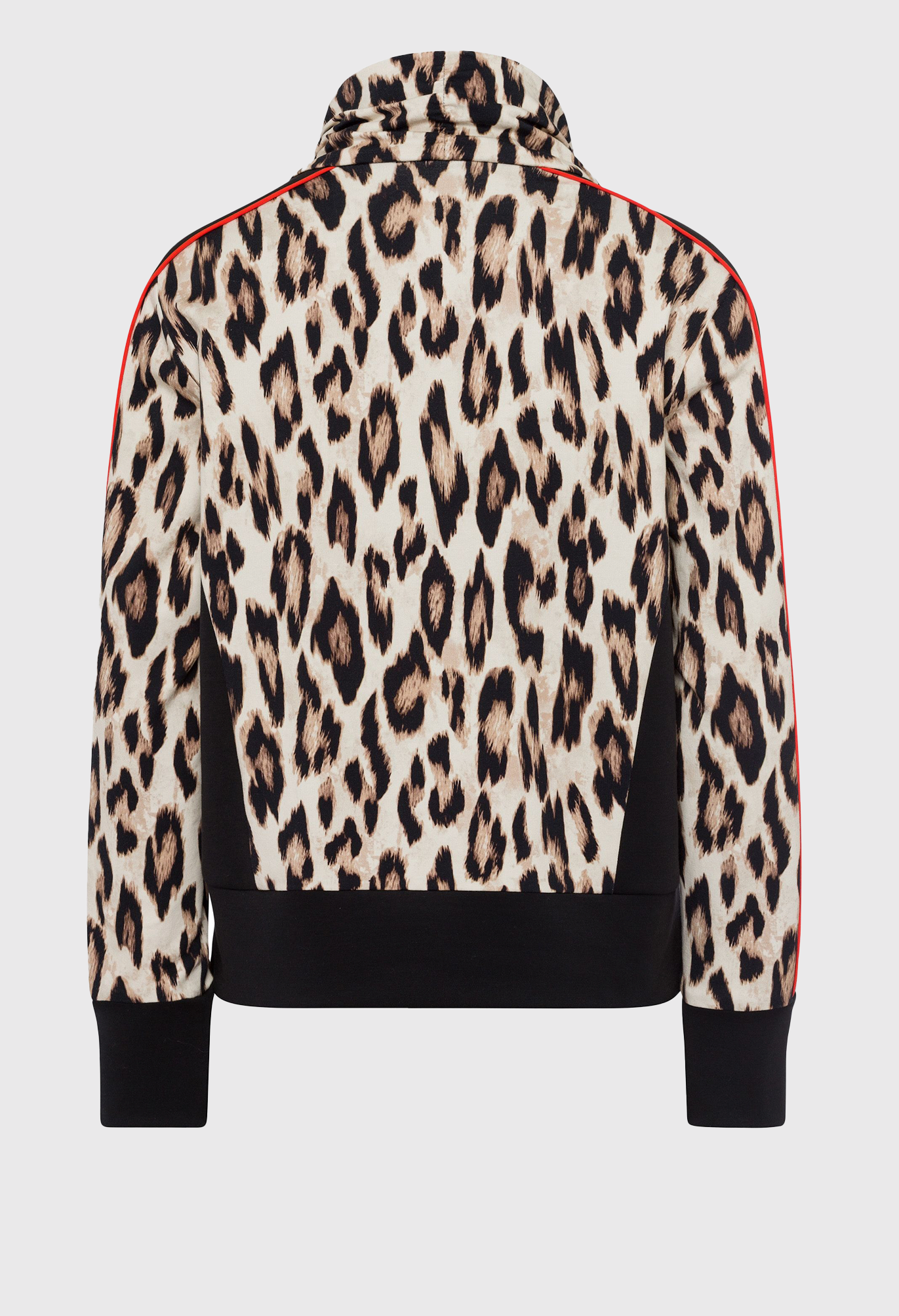 Легкая женская куртка с воротником стойкой и принтованными атласными лентами. Животные принты вряд ли когда-нибудь выйдут из моды, поэтому эта легкая куртка станет вечной модной классикой. Модный дизайн дополняется матовой блестящей тканью и контрастной окантовкой рукавов. Воротник-стойка выглядит стильно благодаря декоративным атласным лентам с принтом. Удобная куртка из джерси, которая подчеркнет спортивный, гламурный повседневный образ.