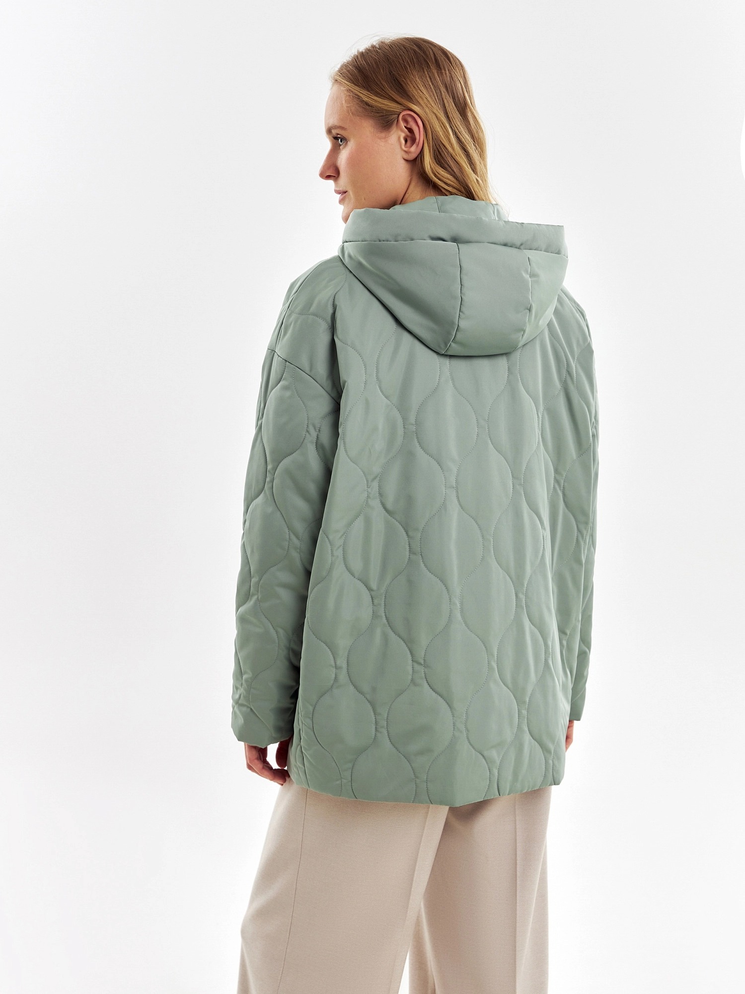 Короткая весенняя куртка из стеганой плащевой ткани в ультрамодном цвете "зеленый айсберг". Куртка имеет прямой силуэт, комфортный рубашечный рукав и высокий воротник-стойку. По бокам располагаются глубокие накладные карманы с клапанами. Застегивается изделие на молнию и установочные кнопки. В комплекте с курткой предлагается съемный капюшон с короткой манишкой. Капюшон, а также карманы и планка куртки выполнены из плащевой ткани-компаньона в цвете основной.