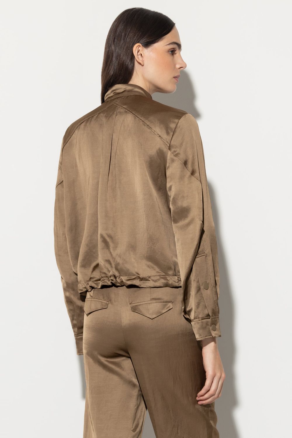 Спортивный объемный блузон из роскошного мерцающего атласа. Сложный крой дополнен планкой на кнопках, боковыми карманами, манжетами на пуговицах и регулируемой кулиской по низу.