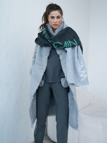 Экодубленка в базовом сером оттенке. Прямой силуэт, отделка имитирующая овчину. Застежка на контрастные пуговицы.