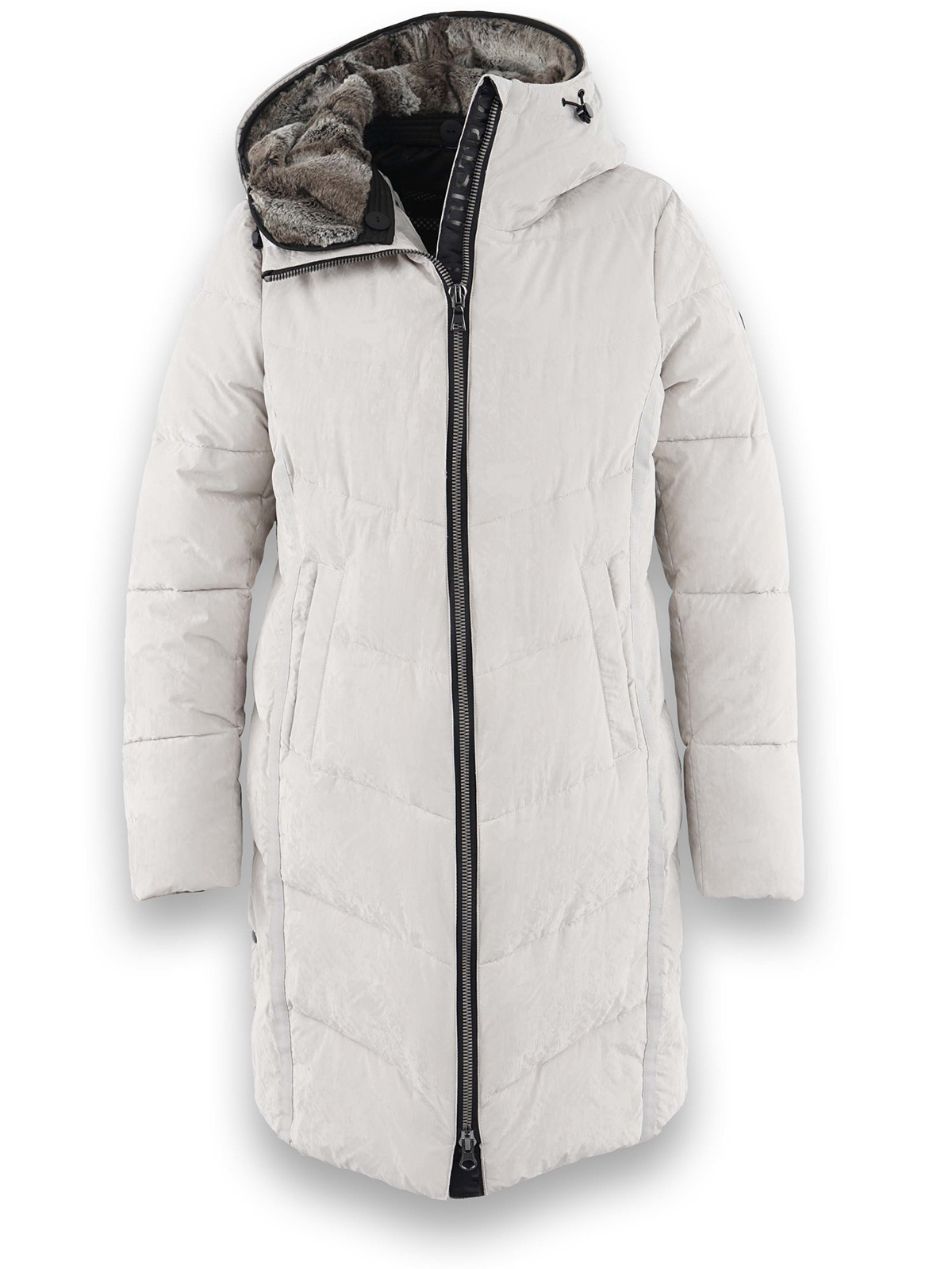 Стеганое однотонное пальто с синтепоном наполнителем. Контрастная молния. Объемный капюшон, боковые карманы с листочкой.