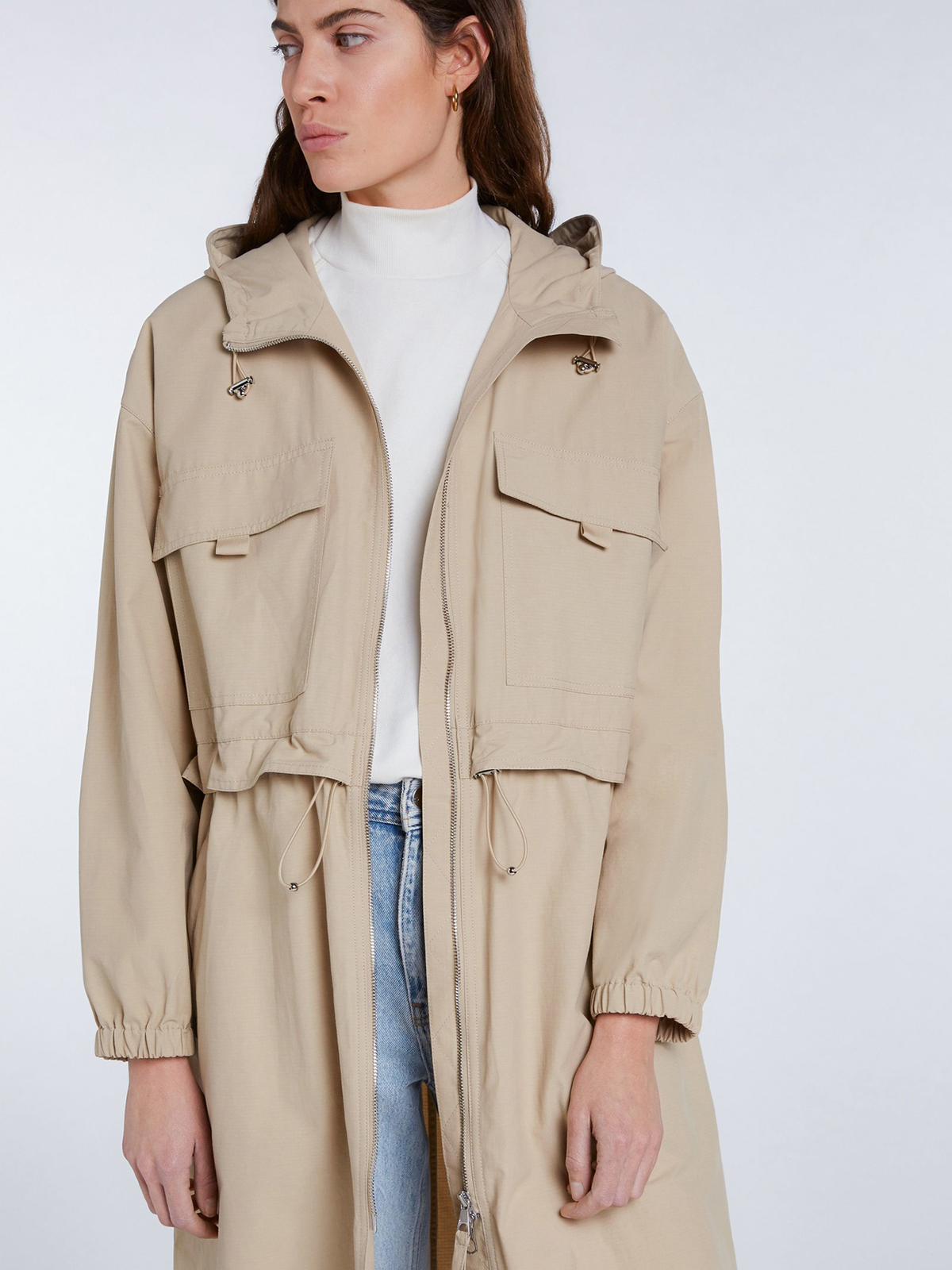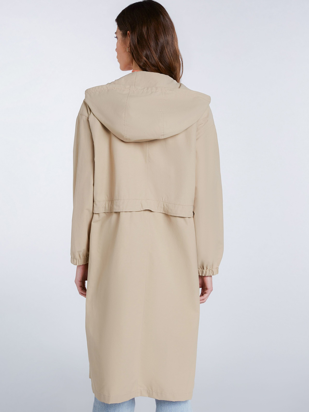 Однотонный плащ в трендовой нюдовой расцветке. Глубокий капюшон с кулиской, воротник-стойка. Кулиска на поясе позволяет создать приталенный силуэт. Объемные накладные карманы на груди, спущенная линия плеч.